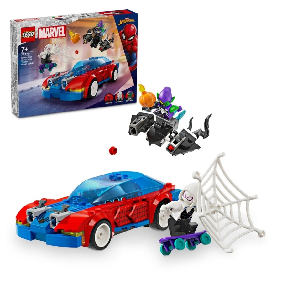 Fanoušci akčních superhrdinů, minifigurek Marvel a super vozidel si přímo zamilují tuto stavebnici z řady LEGO® Marvel se Spider-Manovým autem, kluzákem Zeleného goblina a skateboardem Ghost-Spider. Spider-Manovo závodní auto a Venom Zelený goblin(76279) představuje stylový dárek pro děti od 7 let. Spider-Man, Ghost-Spider a Venom Zelený goblin se utkají v rychlé akční bitvě s řadou vozidel, zbraní a doplňků. Spider-Manovo auto má 2 přední vystřelovače, Zelený goblin se pyšní 2 vystřelovači na kluzáku a dýňovými bombami a Ghost-Spider při jízdě na skateboardu používá 2 ruční vystřelovače pavučin. Spider-Man se houpe na ohebném pavučinovém „laně“ a pomocí velké pavučiny uvězní padouchy. Odnímatelné části stavebnice umožňují přístup do interiéru auta, do kterého se vejdou hned 2 minifigurky a skateboard. Pro ještě více digitální zábavy je zde zábavná a intuitivní aplikace LEGO Builder, kde mohou stavitelé přibližovat a otáčet modely ve 3D a sledovat postup.