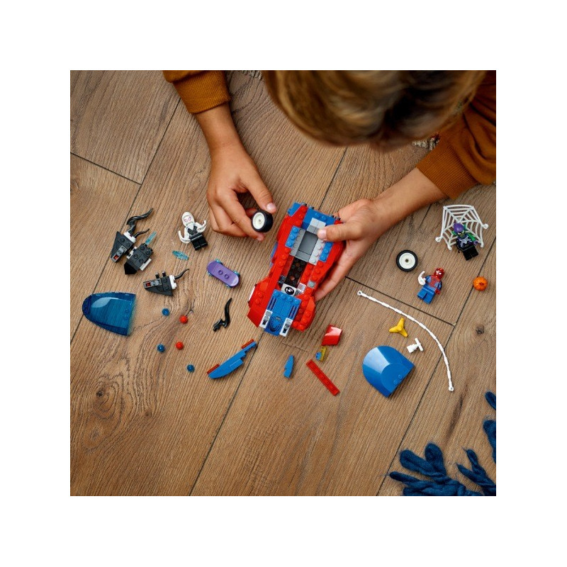 • Stavitelský a herní akční zážitek – Součástí stavebnice pro děti je sestavitelné auto, zbraně, doplňky a minifigurky hrdinů LEGO® Marvel Spider-Mana a Ghost-Spider a padoucha Venoma Zeleného goblina