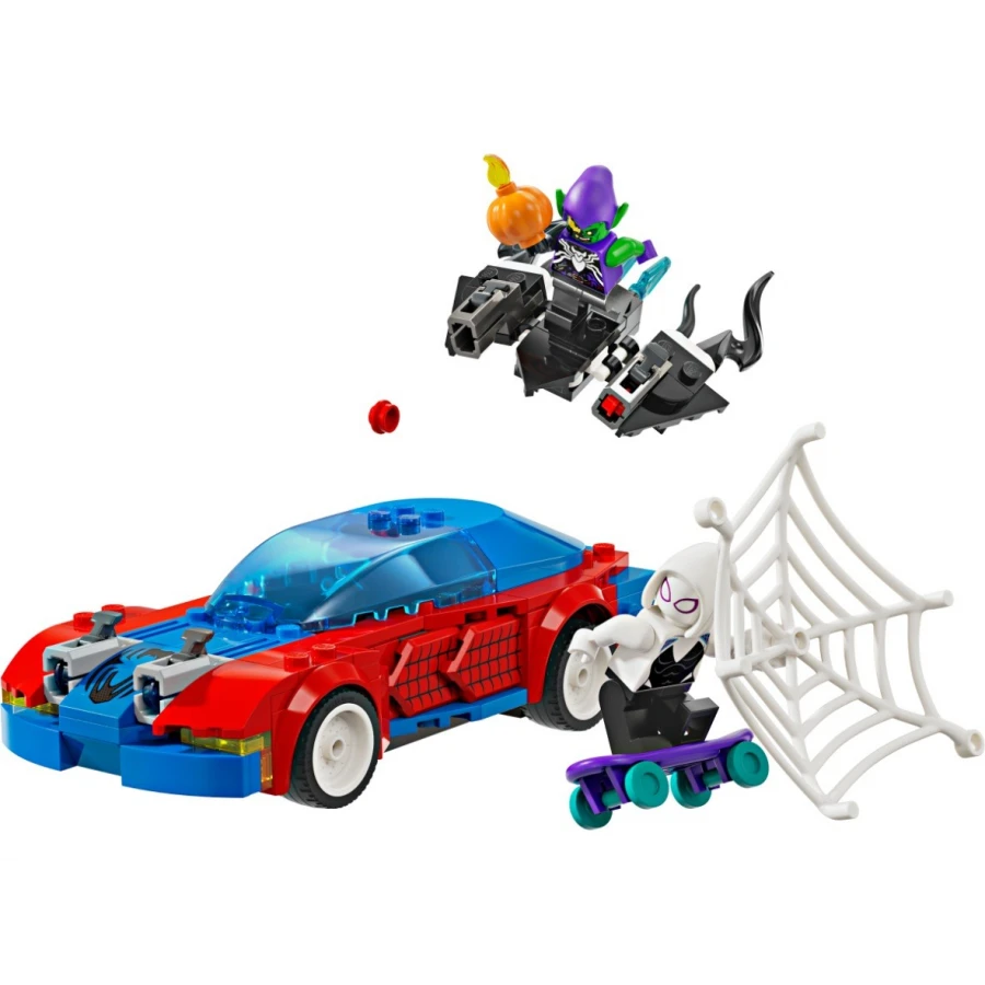 • Superhrdinské akční bitvy na kolech z kostek LEGO® – Spider-Manovo auto má 2 přední vystřelovače, Zelený goblin se pyšní 2 vystřelovači na kluzáku a Ghost-Spider při jízdě na skateboardu používá 2 ruční vystřelovače pavučin