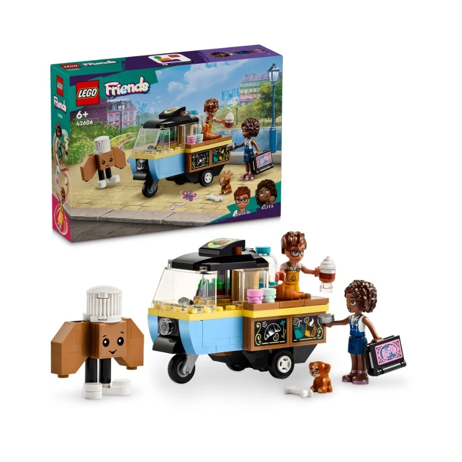 Darujte malým stavitelům od 6 let inspirativní stavebnici LEGO® Friends (42606) Pojízdný stánek s pečivem. Děti, které mají rády hraní rolí, povypráví příběh o tom, jak Aliya navštíví stánek s pečivem se svou fenkou Airou. Součástí stavebnice jsou2 minipanenky, pejsek, stánek, maskot pekárny a doplňky. Součástí stavebnice je celá řada doplňků, se kterými se děti pustí do vytváření vlastních příběhů. Pomohou Julesovi obsluhovat zákazníky u jeho malého stánku s pečivem. Mezi doplňky najdete crois sant, 2 makronky, sušenky, nádobu na sušenky, kávovar, šálek kávy, horkou čokoládu, hrníček s čajem, minci a knihu pro Aliyu a kost pro Airu. Objevte další stavebnice ze světa LEGO Friends pro děti, které milují vaření. Sady nabízí mnoho příležitostí k vyprávění příběhů inspirovaných reálným světem. Stavebnice je kompatibilní s aplikací LEGO Builder, která přináší snadné a intuitivní stavitelské dobrodružství. V ní mohou děti přibližovat a otáčet modely ve 3D, ukládat své stavebnice a sledovat svůj postup.