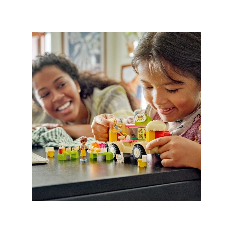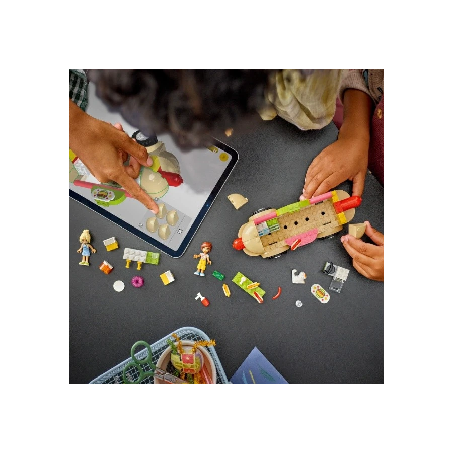Děti od 4 let, které si rády hrají na vaření, se se stavebnicí LEGO® Friends (42633) Pojízdný stánek s hot dogy pustí do vyprávění. Stavebnice pomáhá dětem rozvíjet stavitelské dovednosti a součástí je sestavitelné vozidlo, 2 minipanenky, figurka kocoura a doplňky v podobě jídla, které inspirují k hraní rolí. Tato stavebnice představuje skvělý dárek k narozeninám a jakékoli jiné příležitosti pro děti. Začínající kuchaři, kteří si rádi hrají, pomůžou Kaye připravit a servírovat hot dogy. Leo navštíví pojízdný stánek se svým kocourem Churrem a poklábosí s Kayou o nabídce jídla a pití, mezi které patří tradiční i veganský hot dog, kečup, hořčice a džusy. Stavebnice LEGO pro děti od 4 let jsou navržené tak, aby dětem přinesly rychlý a zábavný stavitelský zážitek. Jsou dodávány s praktickou začátečnickou kostkou – pevným podstavcem, na kterém si děti postaví scénu. Nechte se s dítětem na svém stavitelském dobrodružství provést intuitivní aplikací s návody LEGO Builder, která vám umožní přibližovat a otáčet 3D modely, ukládat stavebnice a sledovat postup.