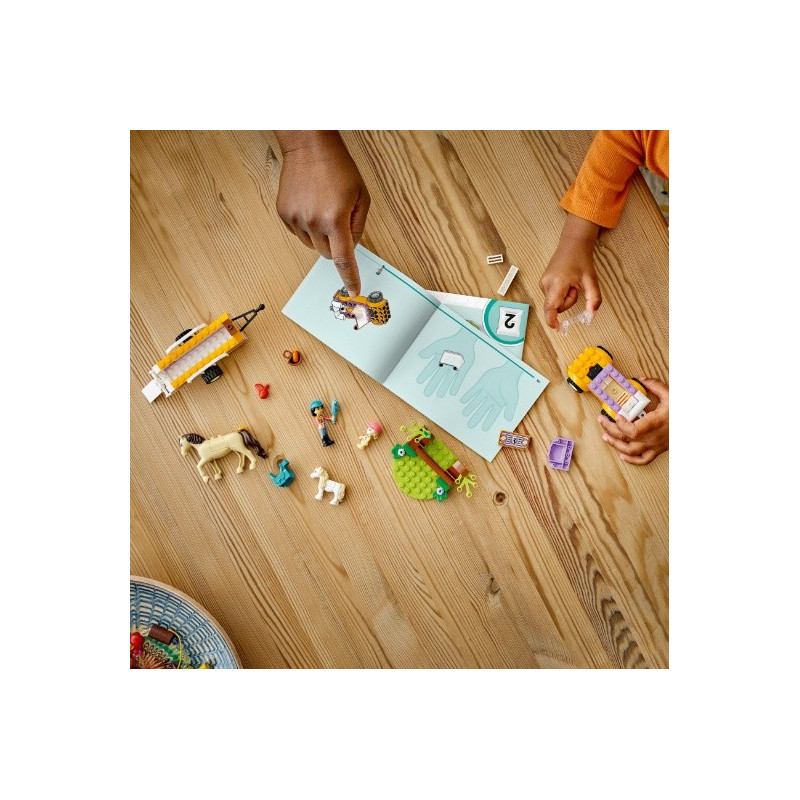 Stavebnice LEGO® Friends (42634) Přívěs s koněm a poníkem pro děti od 4 let nastartuje hodiny kreativního hraní. Děti, které milují příběhy, si postaví model auta a přívěsu a pustí se do vyprávění o dobrodružstvích kamarádek Liann a Zoyi. Tato stavebnice se zvířátky představuje kreativní dárek pro děti. Součástí je kůň pro Liann a poník pro Zoyu a spousta doplňků, které inspirují k zábavnému hraní rolí. Děti pomohou postavám vykartáčovat zvířata a připravit je na jízdu. V lese najdou spadlý strom, který koníkovi a poníkovi poslouží jako překážka na skákání. Po skvělém dni kamarádky koníky odmění chutnou mrkvičkou. Stavebnice LEGO pro děti od 4 let jsou navržené tak, aby dětem přinesly zábavný stavitelský zážitek při hraní s kostkami. Jsou dodávány se začátečnickou kostkou – pevným podstavcem, na kterém si děti postaví scénu. Nechte se s dítětem na svém stavitelském dobrodružství provést intuitivní aplikací s návody LEGO Builder, která vám umožní přibližovat a otáčet 3D modely, ukládat stavebnice a sledovat postup.