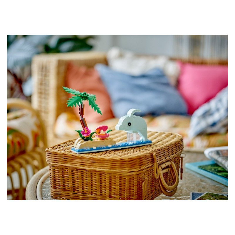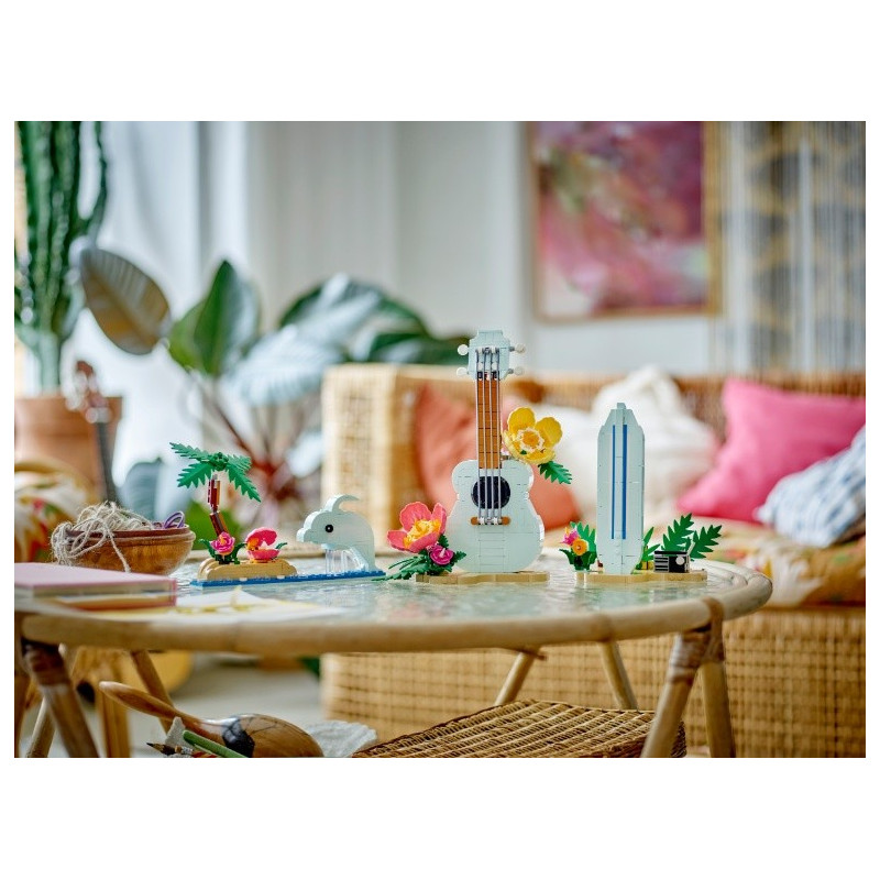 Postavte si modely připomínající klidné chvilky na tropické pláži. Poskládejte si Tropické ukulele s pohyblivými strunami obklopené půvabnými polohovatelnými květinami. Zadrnkejte na hudební nástroj a pak ho přestavte na skákajícího delfína s malým ostrovem, palmou a mušlemi nebo na surfovací prkno na pláži s květinami a rádiem. Užijte si zábavu na sluníčku s touto stavebnicí 3 v 1!