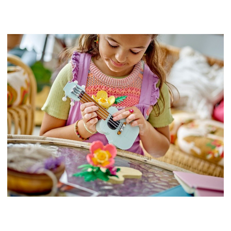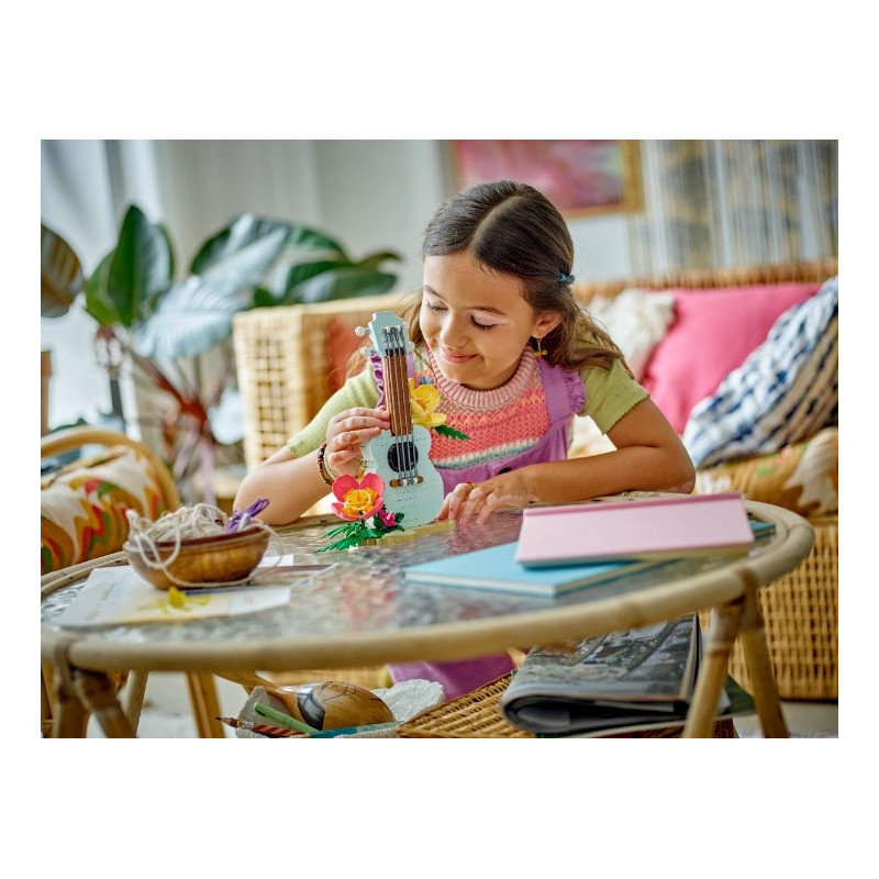 • Rozměry – Tato stavebnice LEGO® se skládá z 387 dílků a součástí je sestavitelné ukulele, kteréměří přes 24 cm na výšku, 14 cm na šířku a 6 cm do hloubky
