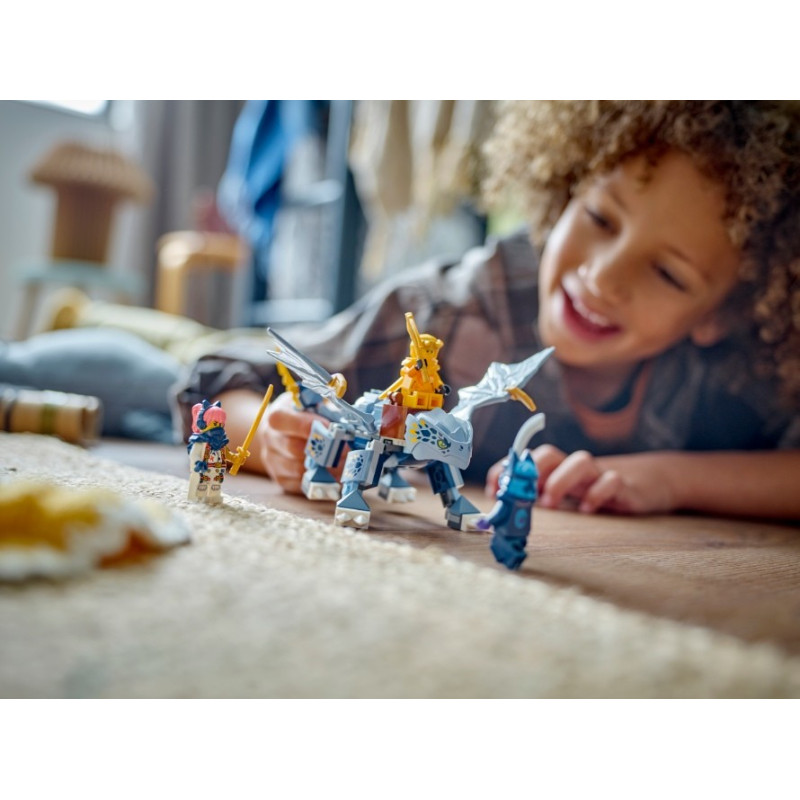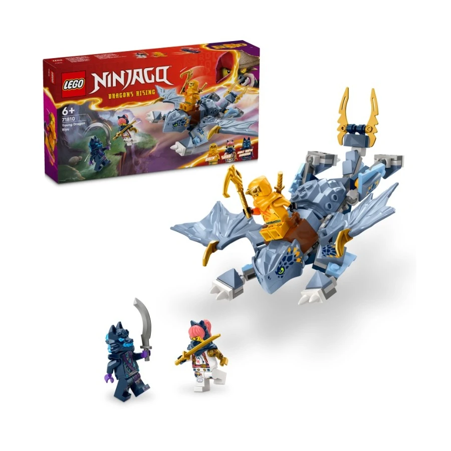 Děti od 6 let si se stavebnicí Dračí mládě Riyu (71810) připomenou scény ze hřbetu draka z 2. řady televizního seriálu NINJAGO® Dračí povstání. Součástí této stavebnice je model Dračího mláděte Riyu s pohyblivými křídly, nohama a ocasem a sedlem, na které lze usadit minifigurku. Součástí této nindžovské stavebnice jsou 3 minifigurky: Arin s lezeckým hákem a katanou, Sora s katanou a zlý válečník s vlčí maskou s mečem. Děti tak budou mít vše, co potřebují k tomu, aby se staly nindžovskými bojovníky a hrály si na akční bitvy. V dalších fantastických stavebnicích z řady LEGO® NINJAGO najdete robotické obleky, vozidla a chrámy a děti si s nimi užijí hodiny hraní na dobrodružství. Všechny stavebnice můžete sestavit s pomocí aplikace LEGO Builder, která vám a vašemu dítěti ukáže snadnou a intuitivní cestu stavitelským dobrodružstvím.