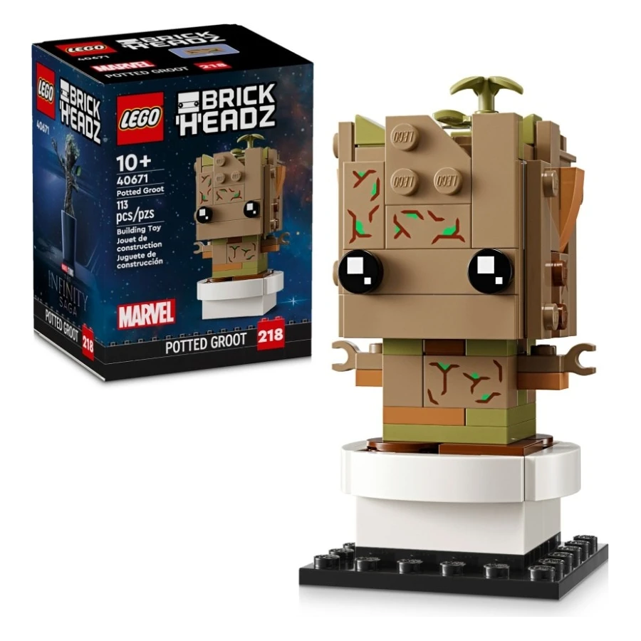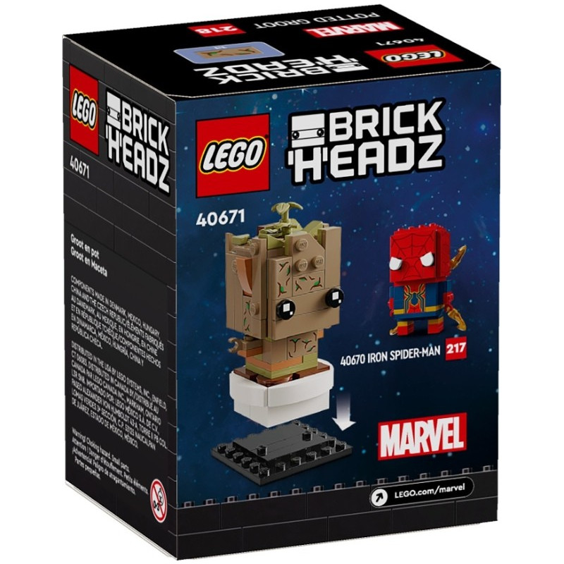 Fanoušci filmu Strážci galaxie od studia Marvel a televizního seriálu Já jsem Groot z dílny Disney+ si zamilují tento model malého mimozemšťana podobajícího se stromu ve stylu BrickHeadz™. Součástí modelu LEGO® BrickHeadz (40671) Groot v květináčije malý Groot, květináč a podložka na stavění. Jednotlivé části modelu lze oddělit.
