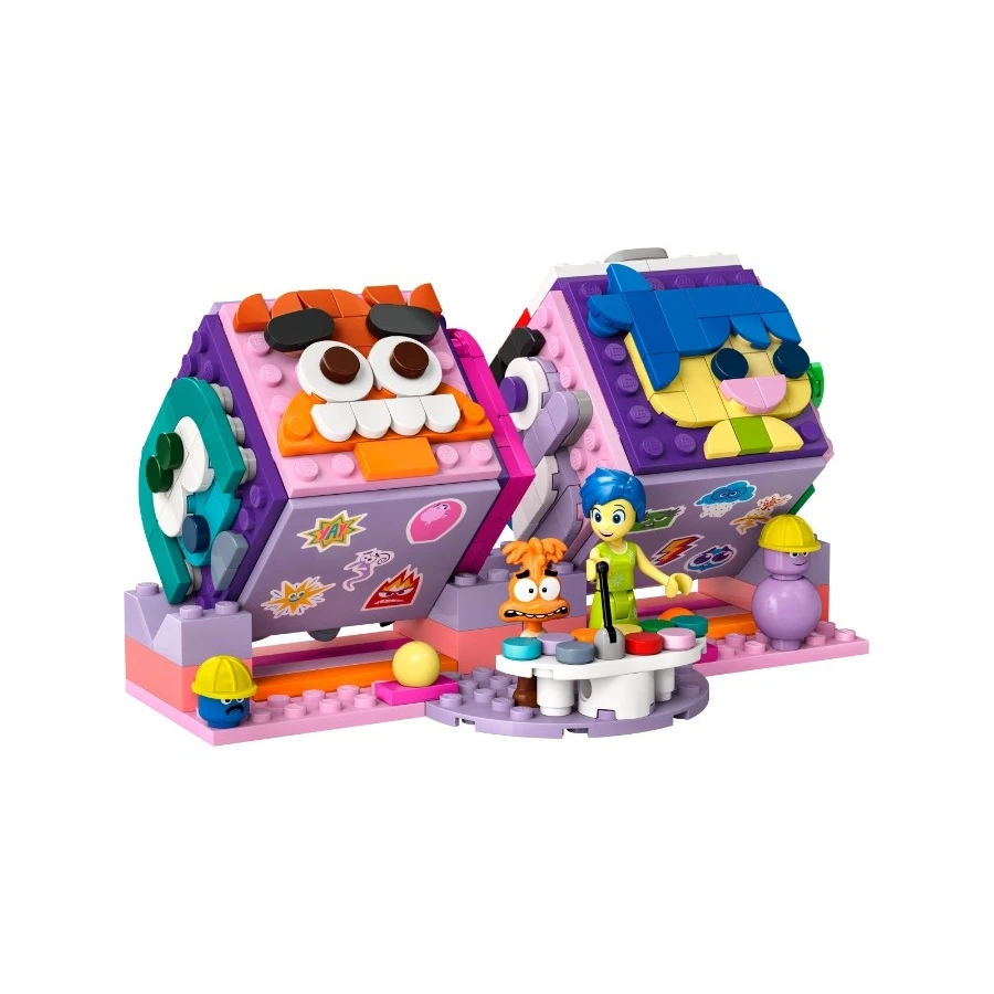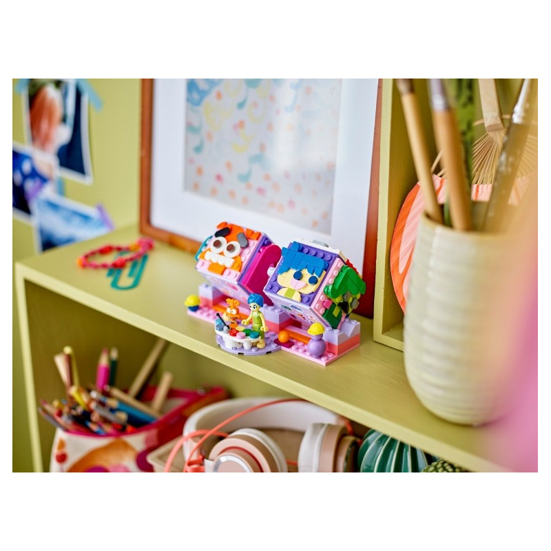 • Sestavitelné kostky nálad – Součástí této kreativní stavebnicejsou 2 kostky nálad, 9 vyměnitelných podložek s náladami, podstavec a minipanenky LEGO® ǀ Disney Radost a Úzkost od Pixaru