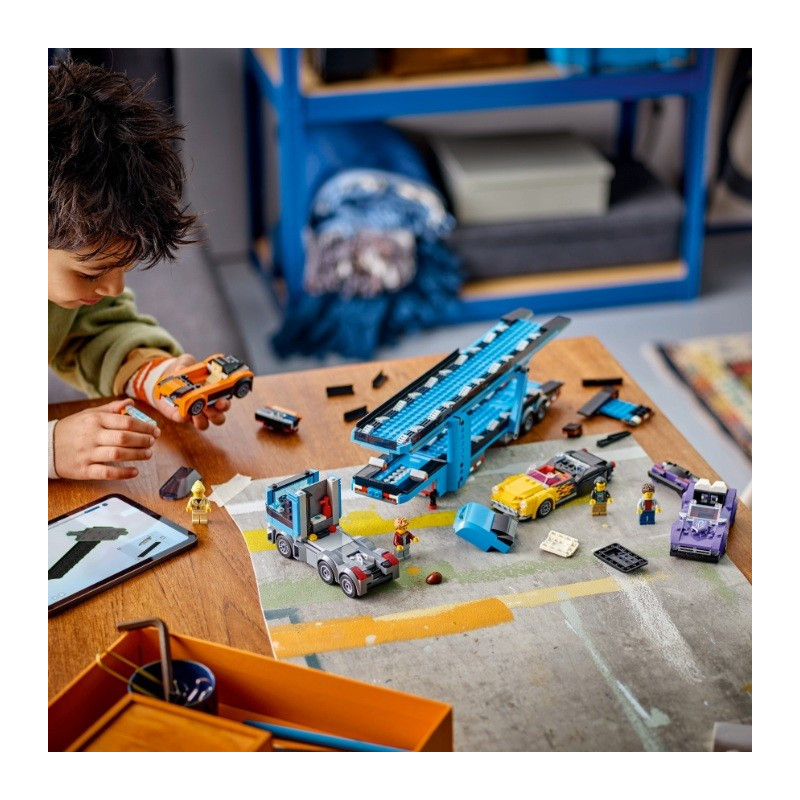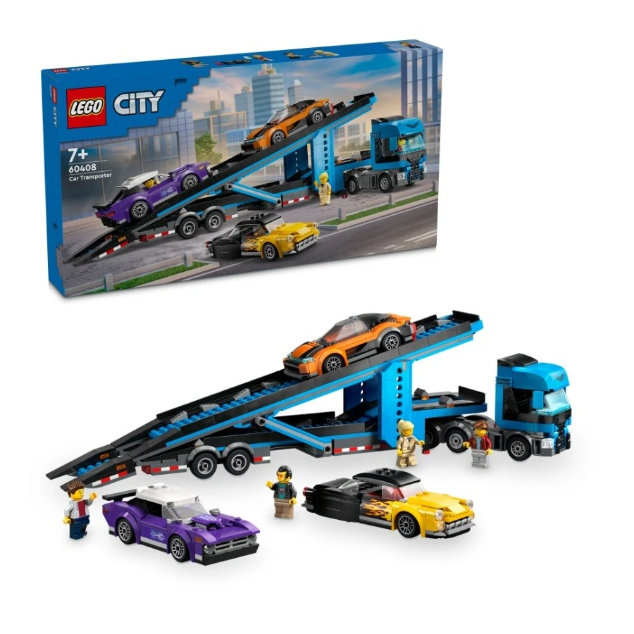 Potěšte milovníky aut od 7 let stavebnicí LEGO® City (60408) Kamion pro přepravu aut se sporťáky. Děti mohou naklonit kabinu řidiče, aby se dostaly k motoru, připojit přívěs a spustit rampy na horní a dolní plošině, aby na přívěs mohly vyjet s vozidlem ve stylu 50. let, výkonným sporťákem ve stylu 70. let a moderním elektrickým superautem. Součástí této působivé stavebnice s kamionem jsou také 4 minifigurky pro kreativní hraní a vyprávění příběhů. Součástí této hračky LEGO s kamionem je podrobný tištěný návod na stavění a 3D návod v aplikaci LEGO Builder, což je digitální průvodce stavěním s intuitivními nástroji přibližování a otáčení. Umožní jim prohlížet si modely ze všech úhlů, zatímco na nich pracují. Stavebnice LEGO City představují skvělé vánoční nebo narozeninové dárky pro děti a součástí jsou parádní vozidla, realistické modely a zábavné postavy, které inspirují nápadité hraní bez hranic. Děti mohou tuto stavebnici kombinovat s dalšími sadami z řady LEGO City (prodávají se samostatně) a rozšířit si tak svět herních možností.