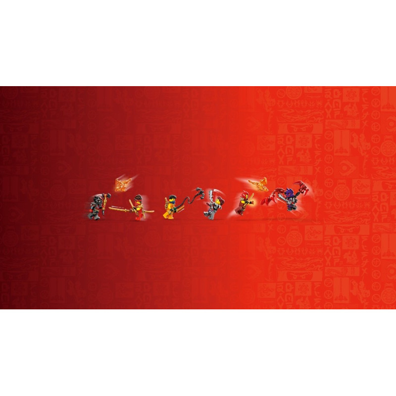 • 6 minifigurek NINJAGO® – Tato nindžovská stavebnice obsahuje nindža válečníky Kaie, Wyldfyre a Arina, a k tomu navíc padouchy Lorda Rase, Jordanu a válečníka s vlčí maskou. Každá minifigurka má vlastní zbraň