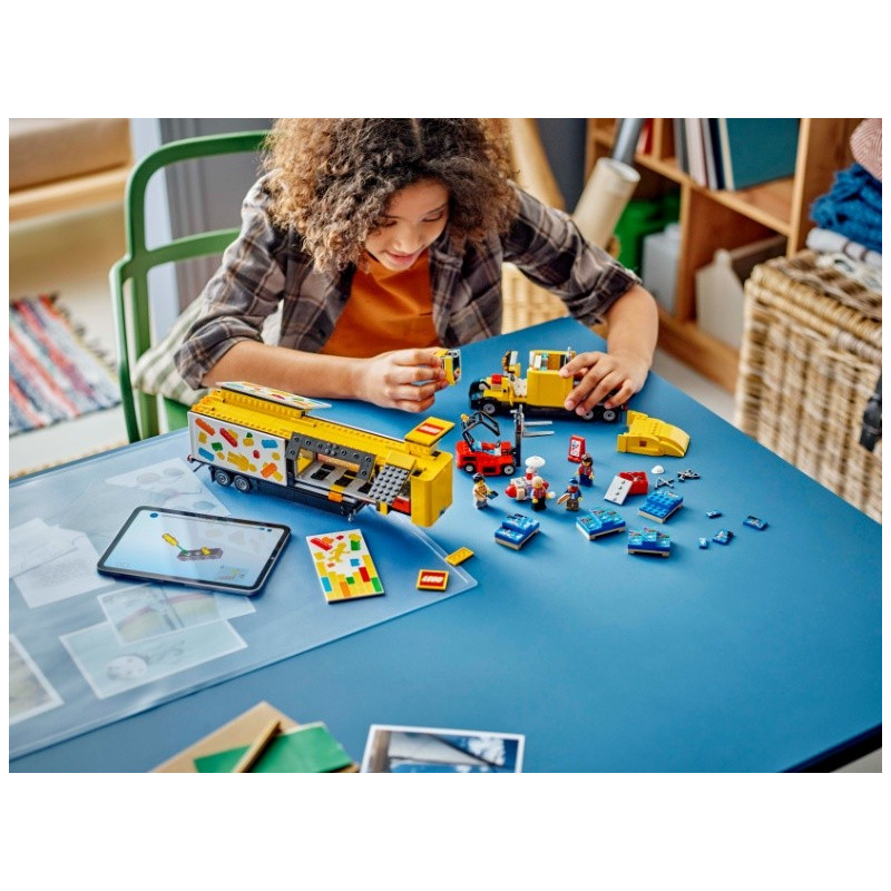 • Model vozidla pro fanoušky LEGO® – Děti otevřou boční panely přívěsu kamionu a pomocí vysokozdvižného vozíku do nákladového prostoru naloží palety se stavebnicemi LEGO