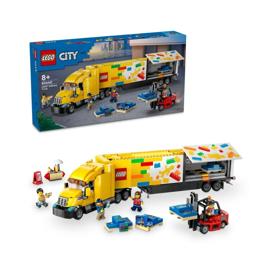 V LEGO® City začíná napínavý den! K doručení jsou přichystány palety stavebnic. Tým připravuje velký kamion k odjezdu a na ulici se prodávají párky v rohlíku. Otevřete boční panely přívěsu a pomocí vysokozdvižného vozíku naložte palety s hračkami do nákladového prostoru. Tento úžasný kamion má dokonce kabinu na spaní na dlouhé cesty! Zkontrolujte motor, naskočte na palubu a vydejte se na dálnici!