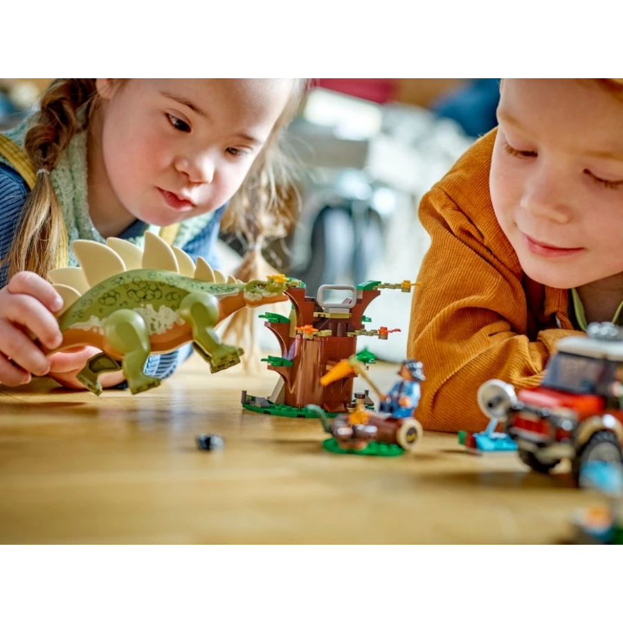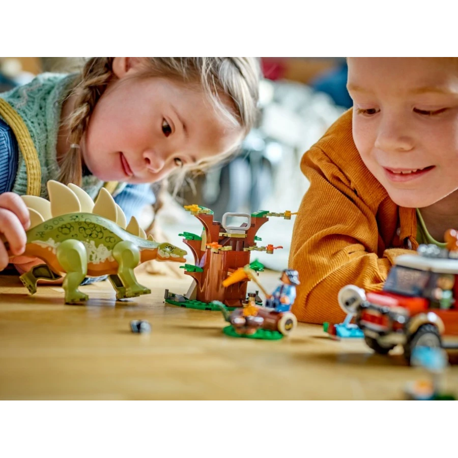 • Dobrodružná kreativní hračka – Součástí je odlévaná figurka LEGO® stegosaura s pohyblivýma nohama, malá figurka velociraptora a minifigurky Bena a Sammy, se kterými se vydáte na dobrodružství