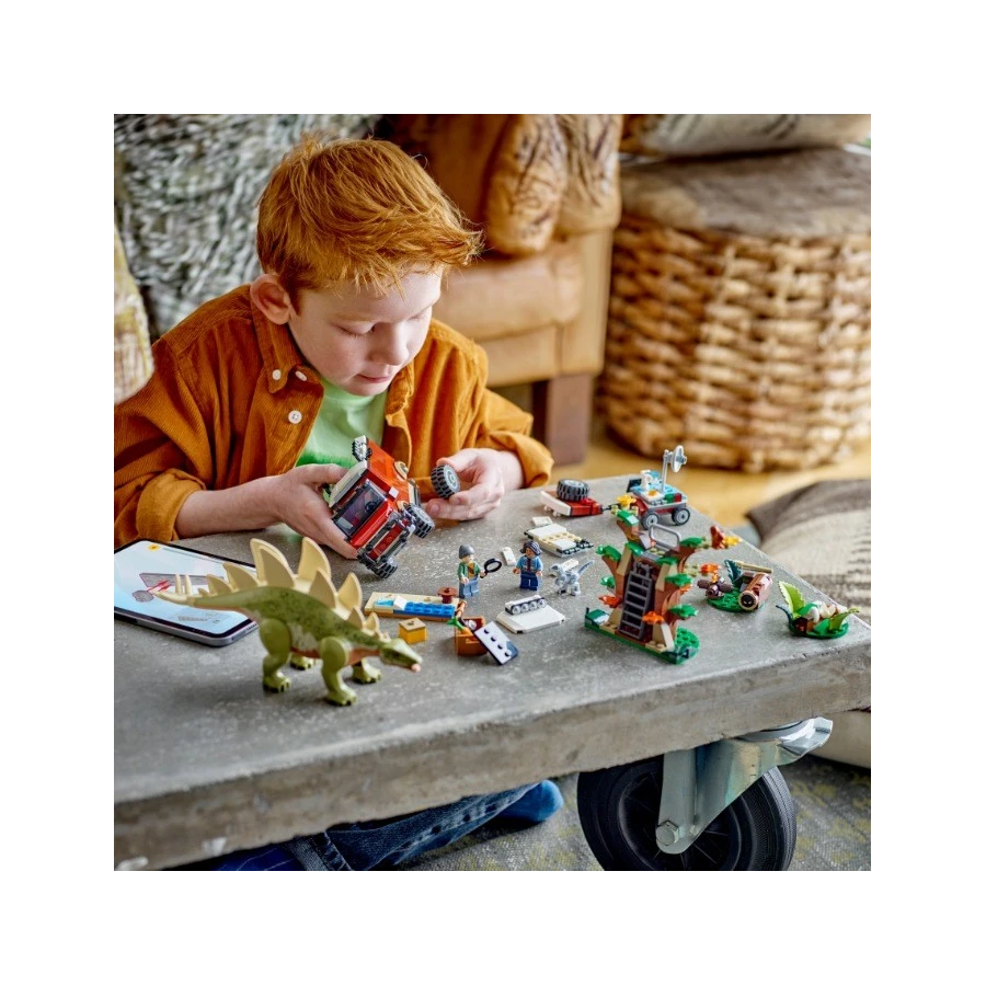 Ve stavebnici Dinosauří mise: Objev stegosaura (76965) fanoušky od 6 let čekají kreativní dobrodružství s dinosaury a model poslouží jako krásný dárek plný hraní na postavy. Po sestavení této sady z řady LEGO® Jurassic World si děti mohou vymysletnekonečné příběhy s odlévanou figurkou stegosaura s pohyblivýma nohama, malou figurkou velociraptora a minifigurkami Bena a Sammy. Součástí stavebnice je také strom s pozorovatelnou a 2 odnímatelnými částmi, terénní vozidlo s prostorem pro 2 minifigurk y, odnímatelnou střechou, otevírací zadní částí, skládací postelí a hned několika úložnými prostory pro drobné dílky. Nechybí malý připojitelný přívěs s pohyblivou satelitní anténou, mikroskopem, obrazovkami a spoustou dalších detailů. Aplikace LEGO Builder malé fanoušky dinosaurů provede intuitivním stavitelským dobrodružstvím. Umožňuje jim přibližovat a otáčet modely ve 3D, ukládat stavebnice a sledovat postup. Stavebnice představuje zábavný dárek za skvělou cenu pro fanoušky řady Jurassic World a potěší také malé milovníky zvířat, dobrodružství a dinosaurů.