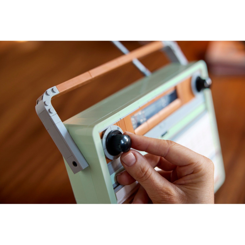 Nalaďte se na nostalgický stavitelský projekt se stavebnicí LEGO® Icons Retro rádio pro dospělé. Užijte si kvalitně strávený čas při stavění propracované repliky vintage rádia. Otáčejte klasickými knoflíky a poslechněte si příjemné praskání analogových signálů a úryvky hudby ze zvukové kostky. Připevněte do zadní přihrádky chytrý telefon, simulujte funkční rádio a vychutnejte si retro zážitek!