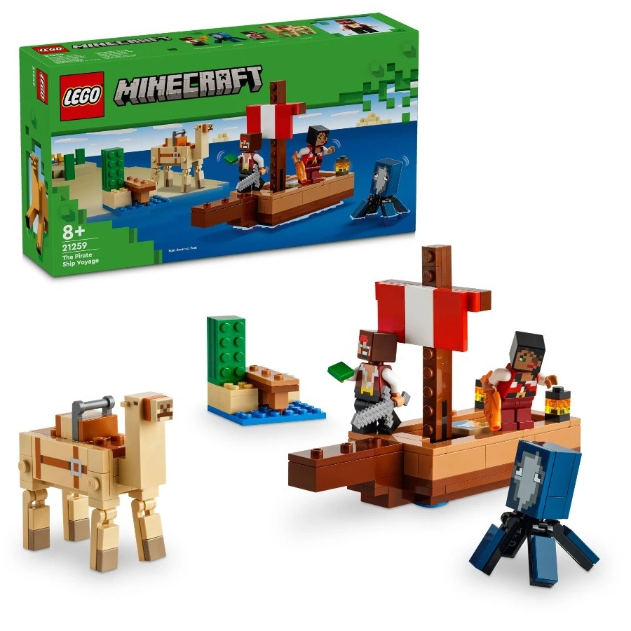 Plavba na pirátské lodi (21259) je dobrodružná stavebnice z řady LEGO® Minecraft®. Stavitelé si s ní mohou hrát samostatně nebo ji zkombinovat s dalšími stavebnicemi (prodávají se samostatně) pro ještě zábavnější zážitek ze hry. Tato všestranná stavebnice pirátské lodi potěší každého fanoušky Minecraftu od 8 let a děti, které mají rády lodě a stavění. Tato dobrodružná pirátská stavebnice LEGO Minecraft obsahuje sestavitelnou loď, oliheň, velblouda, 2 figurky pirátů a doplňky. Tato speciální stavebnice LEGO s piráty, lodí a vůbec prvním dospělým velbloudem v řadě LEGO Minecraft potěší každého fanouška Minecraftu. Na dvojité sedadlo velblouda se vejdou oba piráti, kteří spolu vyrazí na další dobrodružství. Doplňky včetně ryby, mapy, železného meče a kaktusu podněcují nápadité hraní. Stavebnici lze kombinovat s dalšími sadami LEGO Minecraft (prodávají se samostatně) pro ještě více herních možností.