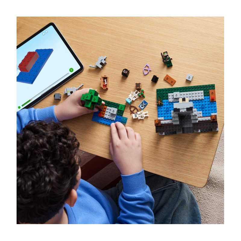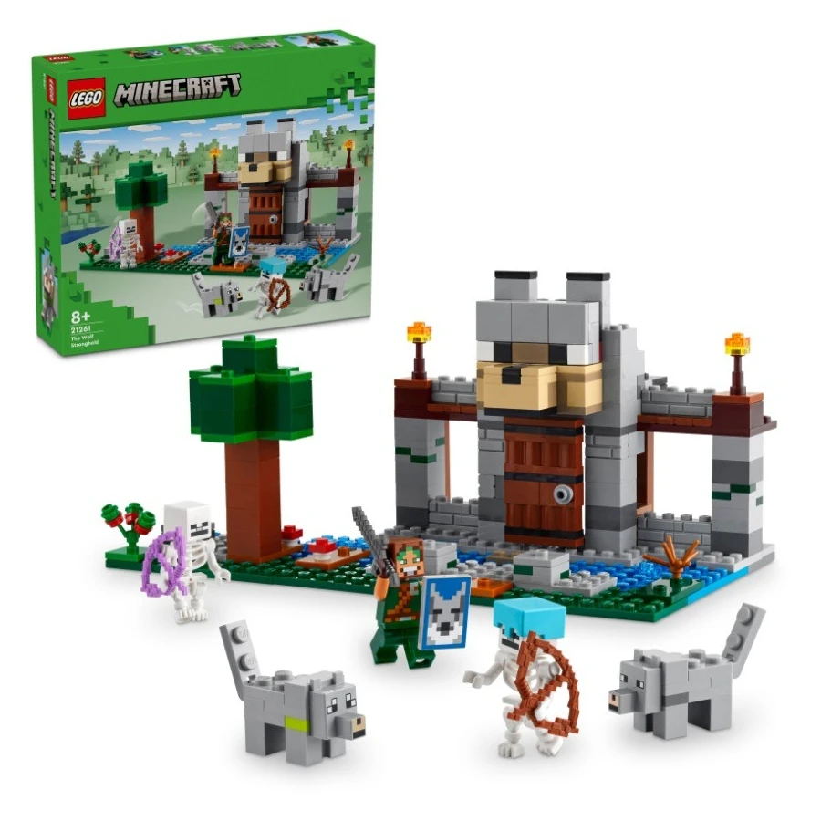 Malí fanoušci akce, dobrodružných stavebnic, modelů pevností a postav ze hry Minecraft® si přímo zamilují stavebnici LEGO® Minecraft (21261) Vlčí pevnost. Tato poutavá hračka pro děti od 8 let inspirovaná videohrou stavitele přenese do světa kreativního stavění, průzkumu a bitevní akce. Děti si postaví základnu krotitelů vlků s velkou vlčí hlavou nad vchodem. Poté se zabaví vyměňováním výrazu tváře vlka z přátelské na rozzlobenou. Uvnitř najdete stůl na tvoření, vysokou pec, kovadlinu a zcela poprvé ve stavebnici LEGO Minecraft také kovářský stůl. V truhle se zásobami najdete netheritový ingot, ze kterého děti mohou vyrobit meč, sladké plody a kosti, které zkrotí divokého vlka. Venku se nachází část lesa se stromem, balvanem, houbou a keříkem s bobulkami. Po lese se potulují 2 figurky kostlivců ze světa Minecraft – jeden se začarovaným lukem a druhý s lukem, šípem a diamantovou přilbou. Více digitální zábavy stavitelé najdou v intuitivní aplikaci LEGO Builder.