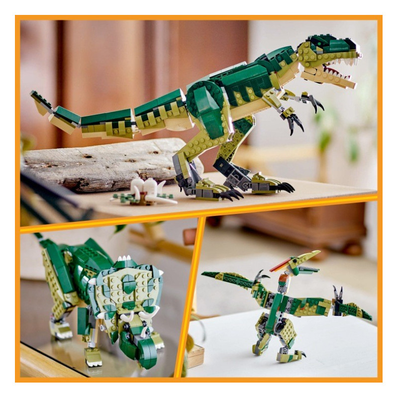 Děti od 9 let se vydají na cestu do minulosti a přehrají si úžasné akční scény s hračkou T-rex (31151). Model tyranosaura rexe má spoustu kloubů a dokáže pohybovat hlavou, chodidly, ocasem, čelistí, nohama, pažemi a dokonce i prsty na nohou a patách. Součástí stavebnice T-rexe je také hnízdo se 2 malými dílky dinosauřích vajec. Společně s modelem dinosaura se bude krásně vyjímat na výstavce na polici nebo nočním stolku. Tato dinosauří stavebnice LEGO® dětem přináší svět plný strhujících herních možností se 3 různými dinosauřími hračkami, které si postaví ze stejné sady kostek. Mohou vytvořit pohyblivého T-rexe, přestavět ho na obávaného triceratopse se 3 rohy nebo ho proměnit v pterodaktyla s velkými pohyblivými křídly. Stavebnice LEGO Creator 3 v 1 představují skvělé dárky pro děti k narozeninám nebo Vánocům. Malí stavitelé v každé krabici najdou dílky k sestavení 3 různých modelů. Se stavebnicemi 3 v 1 si postaví řadu modelů inspirovaných jejich zájmy, včetně parádních vozidel, úžasných zvířat a propracovaných městských scén