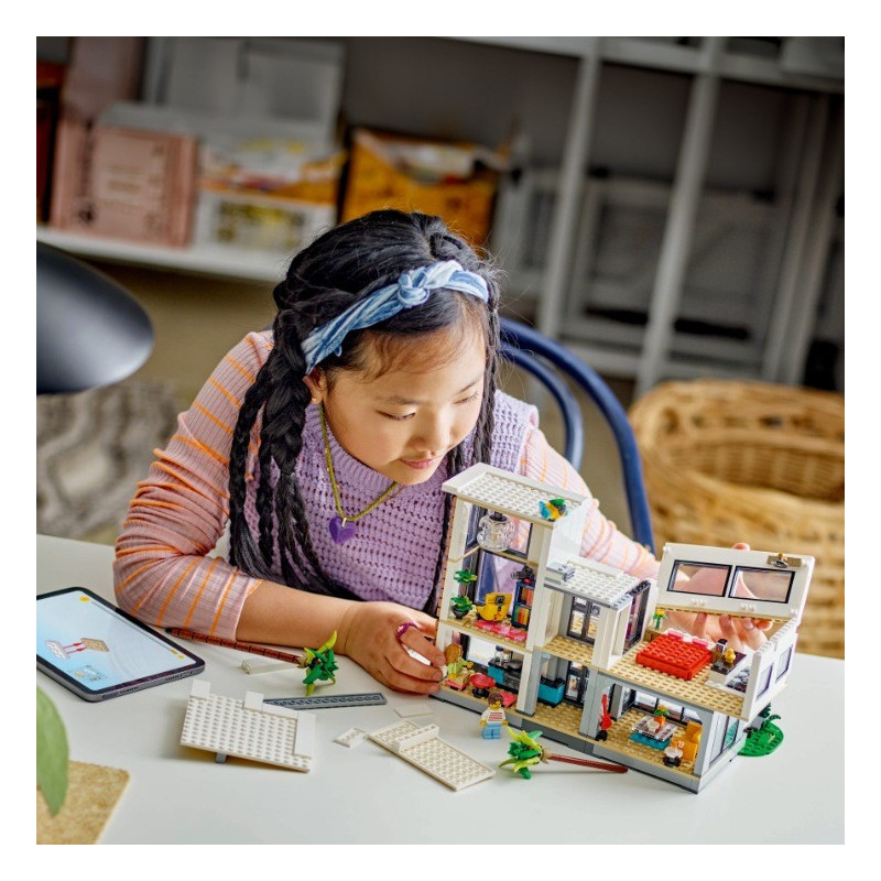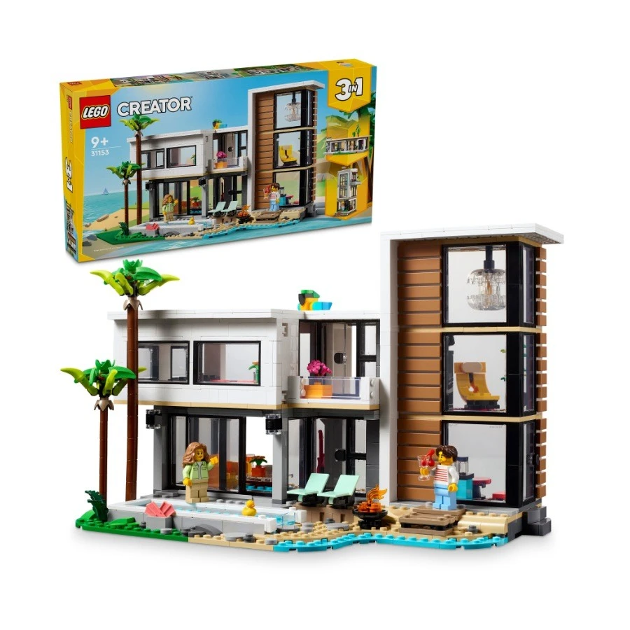 Děti od 9 let se se stavebnicí Moderní dům (31153) vydají na průzkum 3 různých domů z kostek LEGO®. Luxusní 2patrový dům na pláži stojí ve stínu 2 palem a najdete v něm kuchyň, obývací pokoj, čítárnu, ložnici, sprchový kout, balkon a moderní nábytek včetně křesla a lustru. Součást je také bazén, který se stane součástí zábavných příběhů, které děti vymyslí. Tato stavebnice LEGO dětem přináší svět plný úžasných herních možností se 3 různými modely domů, které lze postavit ze stejné sady kostek. Děti si poskládají moderní dům, přestaví ho na stylovou 3patrovou městskou budovu s vířivkou a střešní terasou nebo ho promění v lesní chatu. Moderní dům a 3patrová městská budova umožňují přístup do pokojů zezadu a lesní chata má otevírací střechu. Stavebnice obsahuje 2 minifigurky a fanoušci LEGO jim mohou vyměňovat oblečení. Každý ze 3 modelů lze postavit s pomocí aplikace LEGO Builder a vychutnat si navíc zábavný digitální zážitek.