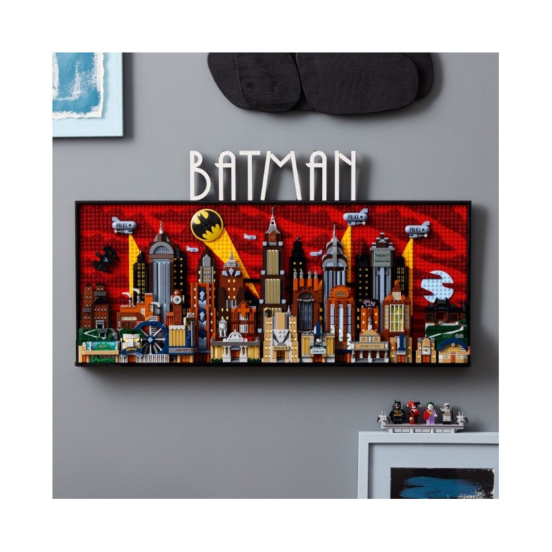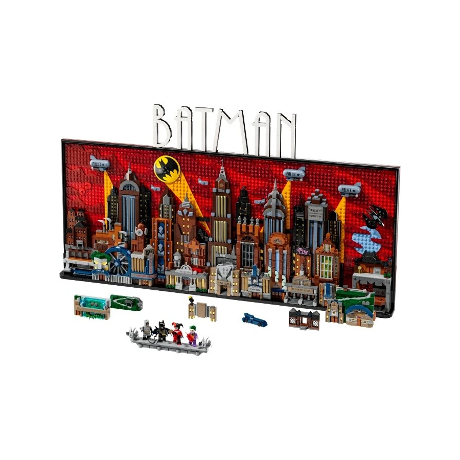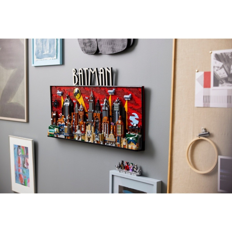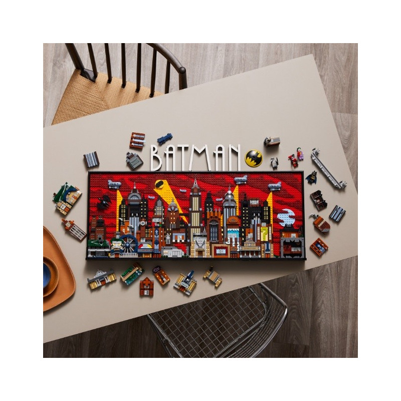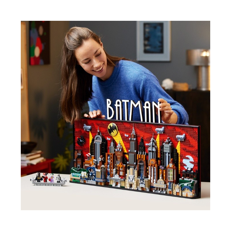 Tato sestavitelná scéna města GOTHAM CITY se skládá z 4 210 dílků a měří přes 76 cm na šířku. Skládá se z 15 panelů, které lze odejmout a odhalit sídlo rodiny Wayneů, Batmanovu jeskyni a ústav Arkham Asylum a také zločiny řady padouchů z animovaného seriálu Batman: The Animated Series. Součástí stavebnice jsou také 4 minifigurky – Batman, Joker™, Harley Quinn™ a Catwoman™. Sestavený model lze pověsit na stěnu nebo umístit na jakoukoli rovnou plochu díky výklopnému podstavci. Součástí stavebnice jsou také 2 návody na stavění, takže se do skládání mohou pustit hned 2 stavitelé současně. Praktická aplikace LEGO Builder obsahuje digitální verzi návodu na stavění, který je součástí stavebnice.