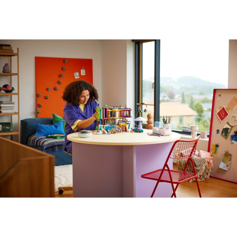 Potěšte touto pohlcující stavebnicí děti a teenagery, kteří milují kreativní stavění. Sada Andrea a její moderní dům (42639) představuje skvělý dárek pro stavitele od 14 let a najdete v ní 11 postav LEGO® Friends a spoustu doplňků. Teenageři si vesvém pokoji hrdě vystaví velkolepou stavebnici čtyřpatrového rodinného domu s několika venkovními prostory, včetně bazénu, vířivky, klavíru, karaoke, místa na zen jógu a vodopádu tekoucího ze střechy. Působivý je i interiér, ve kterém najdete dětský po koj, koupelnu a Andreinu ložnici s otáčecí postelí. Ve sklepě se nachází nahrávací studio a garáž. Při otevření vrat garáže z ní vyjede auto. Nechybí ani funkční výtah, kterým se dopravíte do jednotlivých pater. Fanoušky stavebnic LEGO Friends přímo nadchnou postavy, které v sadě najdou – kromě nových figurek nechybí ani staré známé kamarádky Friends.