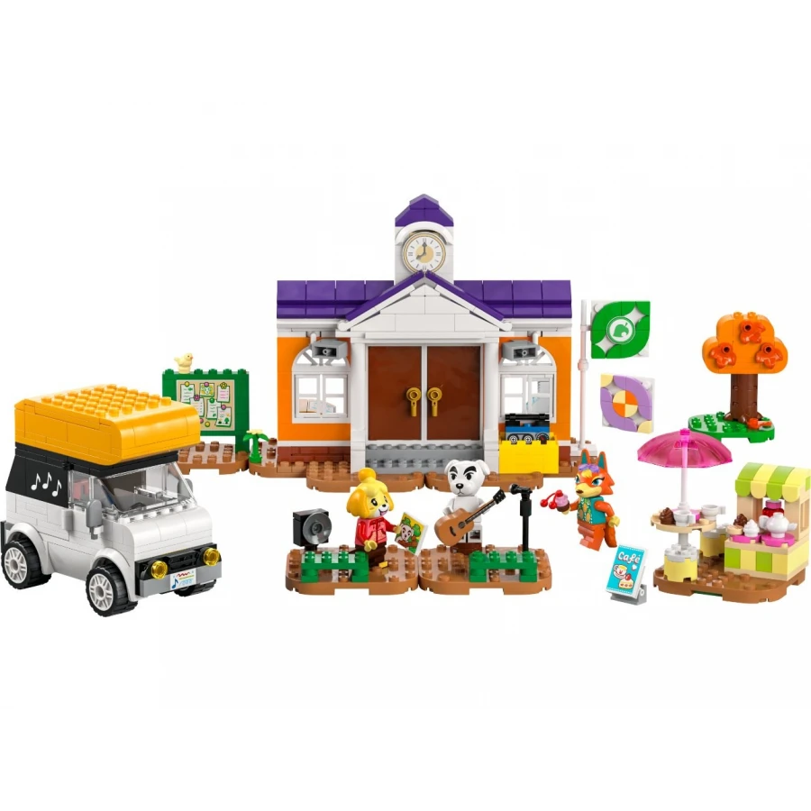 Holky a kluci ve věku od 7 let si se stavebnicí K.K. a koncert na náměstí (77052) vymyslí vlastní příběhy inspirované sérií videoher Animal Crossing™. Nejdříve si postaví scény z videohry a poté si mohou hrát se 3 minifigurkami LEGO® Animal Crossing a mnoha známými doplňky ze série těchto videoher, ať už je jejich představivost zavede kamkoli! Děti připraví koncert K.K. tak, že ze střechy karavanu přinesou jeho mikrofon, předstírají, že hrají na kytaru, nebo se připojí k Isabelle při skupinovém protahování. V kavárně si s Audie poví všechny novinky a pak se vydají na radnici, kde mohou získat vlastnoručně vyrobený leták s receptem, získat odměny v bankomatu a zkontrolovat krabici na tříděný odpad, jestli něco nepřibylo. Stejně jako ve hře čeká i tady ve stromě překvapení a děti si můžou samy navrhnout vlajku budovy Resident Services. Je možné také přestavět podložky na stavění a změnit tak vzhled stavebnice LEGO Animal Crossing.