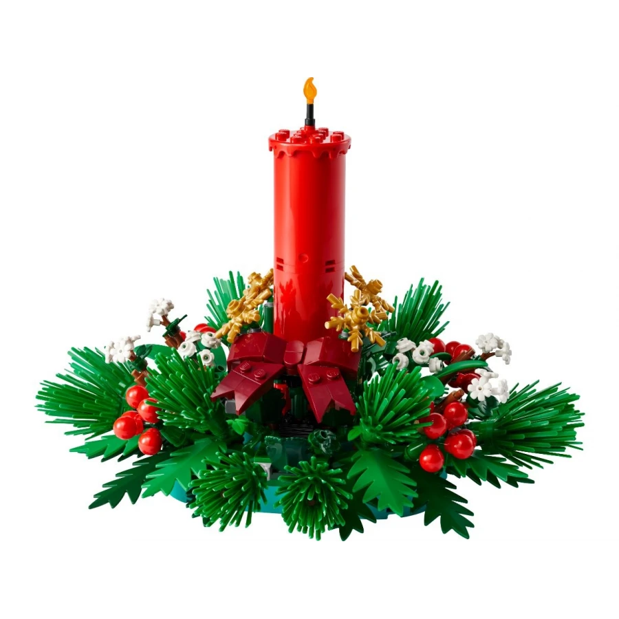 • Obklopte se radostí – Tato vánoční stavebnice LEGO® se skládá z červené svíčky obklopené červenýmibobulemi, zlatými hvězdami a zeleným listím
