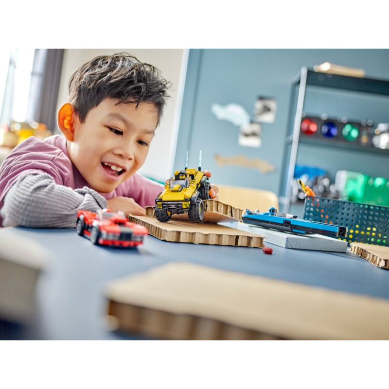 Připravte se na akční dobrodružství LEGO® 2KDRIVE! Otestujte 3 parádní auta se stavebnicí LEGO City Sada všestranných závoďáků. Uhánějte v závodech po silnici, v terénu a na vodě. Při závodu můžete střídat auta jako ve videohře a přizpůsobit si je rychlou výměnou kombinovatelných modulů. Stavebnice obsahuje červené sportovní auto, žluté SUV, modrý motorový člun a 3 závodníky.