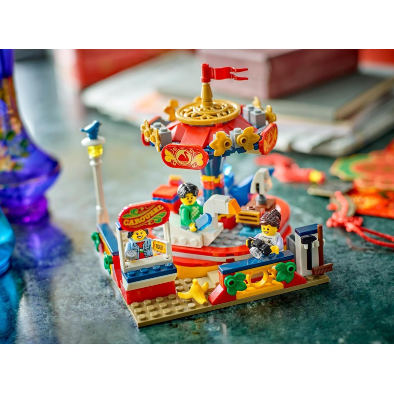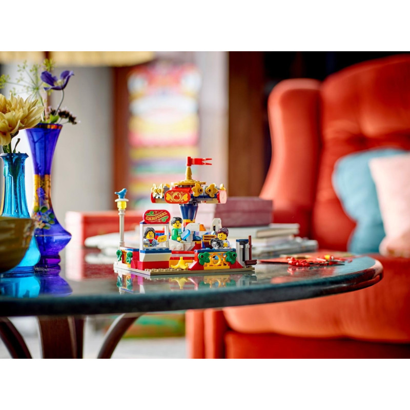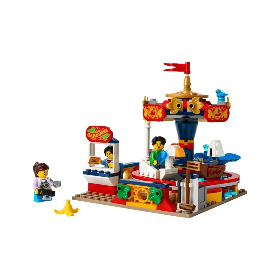 • 3 minifigurky – Prodavačka lístků, chlapec se zmrzlinou a dívka s fotoaparátem, kteří se mohou vozit v kabinkách kolotoče