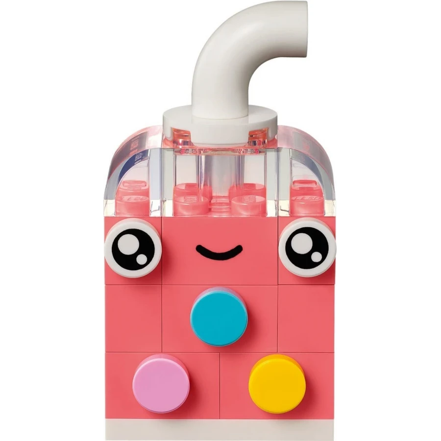 • Různé kostky a zábavné dílky – Stavebnice obsahuje barevné kostky různých tvarů a speciální dílky, jako jsou oči, ústa a dekorativní prvky