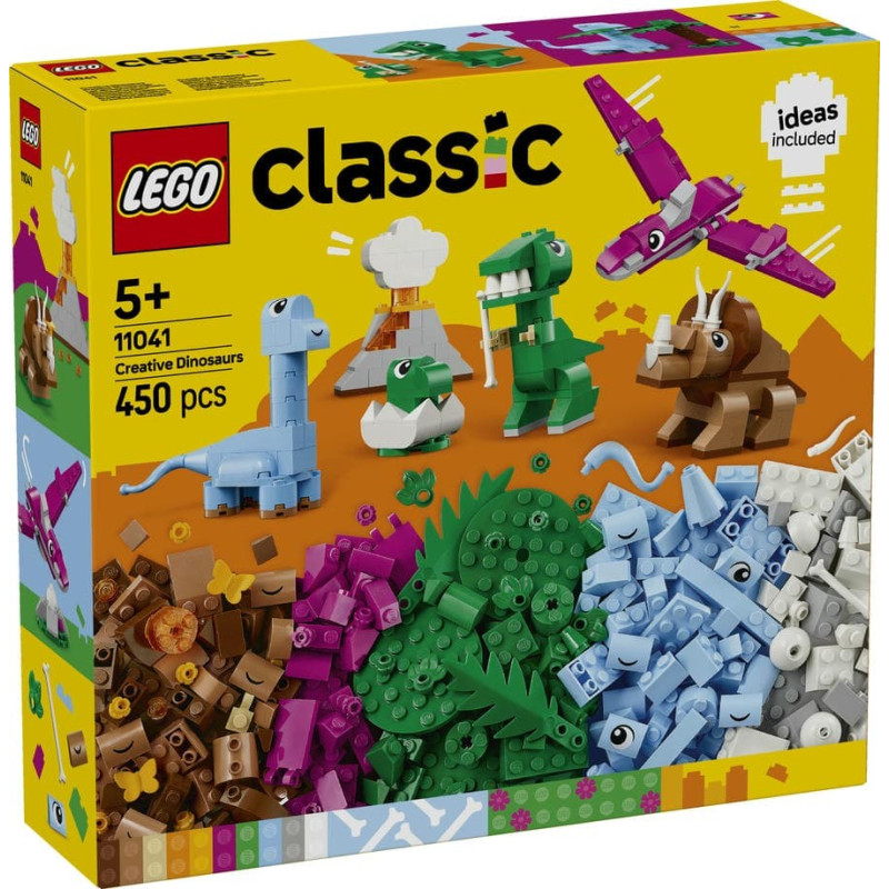 LEGO® Classic (11041) Kreativní dinosauři je stavebnice s figurkami dinosaurů z kostek v modré, zelené, fialové a hnědé barvě. Tato neuvěřitelně všestranná stavebnice pro děti představuje skvělou hračku pro rozvoj kreativních stavitelských dovedností u dětí od 5 let, které milují dinosaury. Tato stavebnice plná rychle sestavitelných modelů dinosaurů LEGO obsahuje T-rexe, ptakoještěra, triceratopse, brontosaura a mládě T-rexe ve vejci. Součástí stavebnice je také sopka, palma a doplňky, které děti inspirují k hraní. Kromě barevných kostek stavebnice obsahuje také speciální dílky, včetně očí a úst, které dinosauřím tvářím dodají různé výrazy obličeje. Kreativní zábava bude pokračovat, když děti promíchají kostky a modely přestaví. Až děti získají větší sebevědomí při stavění, mohou podle intuitivního návodu na stavění vytvářet vlastní nápadité dinosaury.