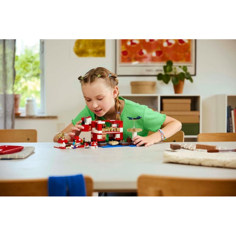 Stavebnice LEGO® Minecraft® (21270) Krávomůrčí domek zaručeně potěší hráče Minecraftu a malé milovníky stavění domů, péče o zvířata a odrážení občasných útoků ze vzduchu! Tato poutavá stavebnice představuje skvělý dárek ze světa Minecraft pro holky a kluky od 8 let. Tato stavebnice LEGO Minecraft se nachází na houbovém ostrově a obsahuje oblíbenou postavu Steva, červenou krávomůrku, malou červenou krávomůrku, hnědou krávomůrku, tříbarevnou kočku a nepřátelský létající přízrak. Stavebnice je plná prvky, které se objevují ve hře, včetně malé farmy s pšenicí, houbami a rostliny rostoucí vedle kompostéru. Mezi doplňky najdete rybářský prut, tresku, motyku, netheritový meč, misku, loďku s vesly, truhlu, pec, pracovní stůl, knihovnu, chléb a postel. S aplikací LEGO Builder si děti užijí ještě větší porci zábavy. Umožní jim na jejich zařízení přibližovat a otáčet modely ve 3D.