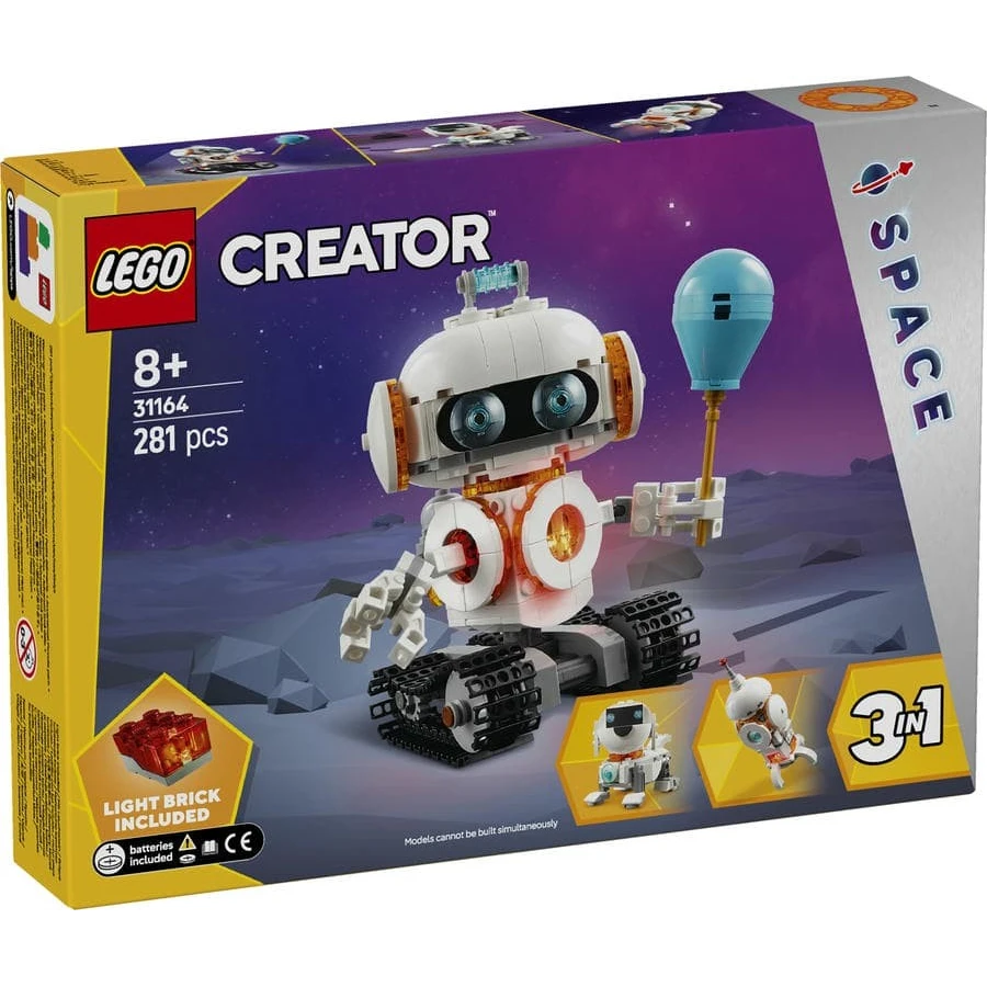 Kluci a holky od 8 let si přehrají příběhy z hvězd s vědeckou stavebnicí LEGO® Creator 3 v 1 (31164) Vesmírný robot. Tento model robota pro děti má pohyblivé pásy a jetpack, otáčecí tělo a hlavu, pohyblivé paže a prsty, balón a světelnou kostku, která osvětluje jeho trup. Fanoušci LEGO můžou stavět a přestavovat 3 různé akční vesmírné modely ze stejných kostek: robota na pohyblivých pásech, pohyblivou figurku vesmírného psa s kostí a létajícím diskem nebo vesmírnou raketu. Všechny 3 modely představují parádní dárky s vesmírnou tematikou, se kterými si děti užijí spoustu zábavy. Stisknutím světelné kostky (baterie jsou součástí balení) děti model rozsvítí. Stavebnice LEGO Creator 3 v 1 představují skvělé dárky pro děti díky 3 různým možnostem stavění v každé krabici. Tyto stavebnice jsou součástí působivé řady, která potěší milovníky parádních vozidel, úžasných zvířat a propracovaných domů a malí stavitelé si s nimi vychutnají hodiny kreativního hraní. Upozorňujeme, že modely nelze sestavit najednou.