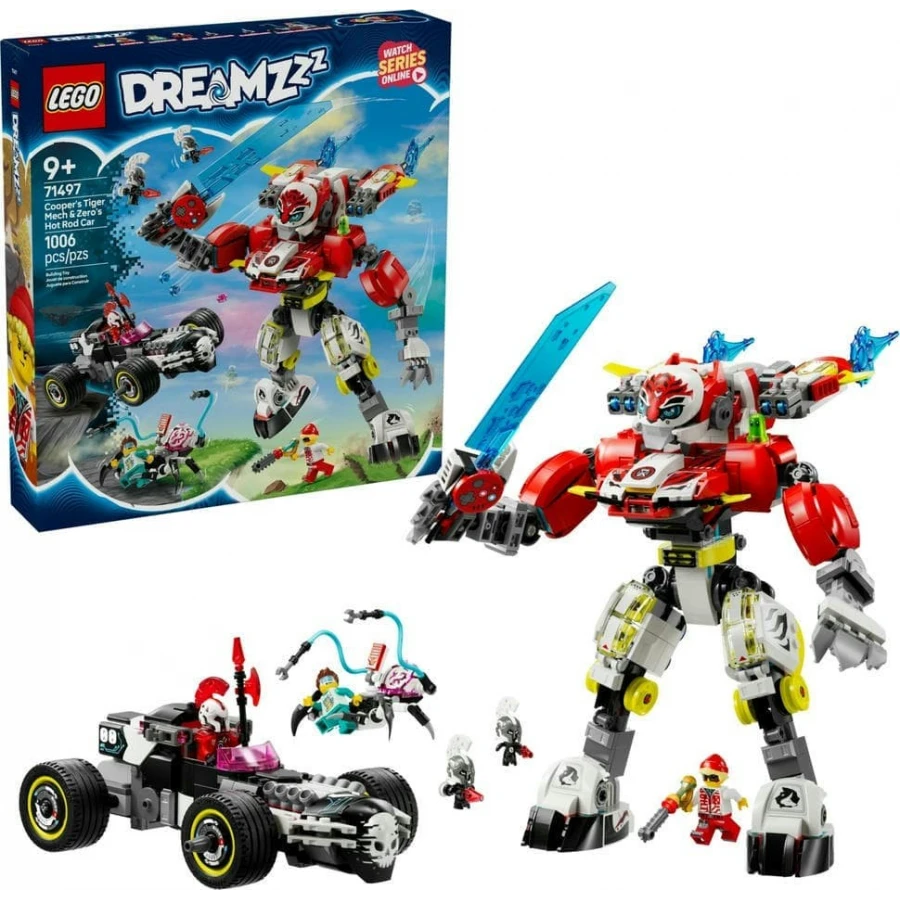 Dupněte na plyn kreativity se stavebnicí LEGO® DREAMZzz™ (71497) Cooperův tygří robot a Zerův hot rod pro kluky a holky. Tato stavebnice s autem a robotem je inspirovaná televizním seriálem a děti od 9 let se s ní připojí se k hrdinovi Cooperovi na jeho velkolepém dobrodružství za záchranou nevinného snílka. Stavebnice přináší hned 2 strhující možnosti stavění a děti si užijí spoustu zábavy při stavění červeného herního letadla, které pak přestaví na tygřího robota a hot rod nebo na rychlé závodní auto a robota. Tygří robot a robotické stvoření se dokážou hýbat a oba režimy stavění se pyšní řadou skvělých funkcí. Součástí stavebnice závodního auta je také minifigurka Coopera, Zera a snílka, Z-Flek, Kybermozkový pavouk a 2 Kybervěci, které vdechnou život akci a podnítí nápadité hraní. Tato přestavitelná stavebnice obsahuje návody na stavění vedené příběhem, které malým snílkům pomáhají ponořit se do akce. Představuje skvělý tip na dárek pro děti, které milují televizní seriál LEGO DREAMZzz, vozidla a robotické hračky.