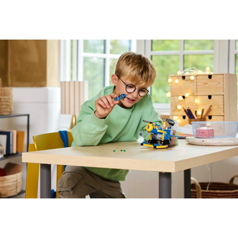 • Přestavitelný robot – Tato stavebnice LEGO® nastartuje akční zábavu s robotickým oblekem Tailse, který se po vyklopení nohou a otočení dopředu změní z režimu chůze na režim létání