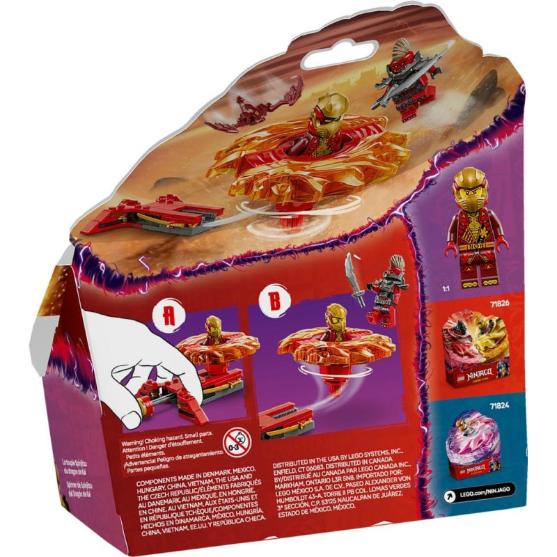 Připravte Kaie na akční bitvu proti zlotřilému dračímu zvědovi! Umístěte mistra ohně do dračího Spinjitzu spinneru a stiskněte tlačítko odpalovače. Sledujte, jak rychle vystřelí a roztočí se, aby porazil svého zlého protivníka. Když spinner zasáhne svůj cíl, je možné, že odletí 2 prvky síly. Kai musí zvítězit, aby zachránil nový svět NINJAGO®!