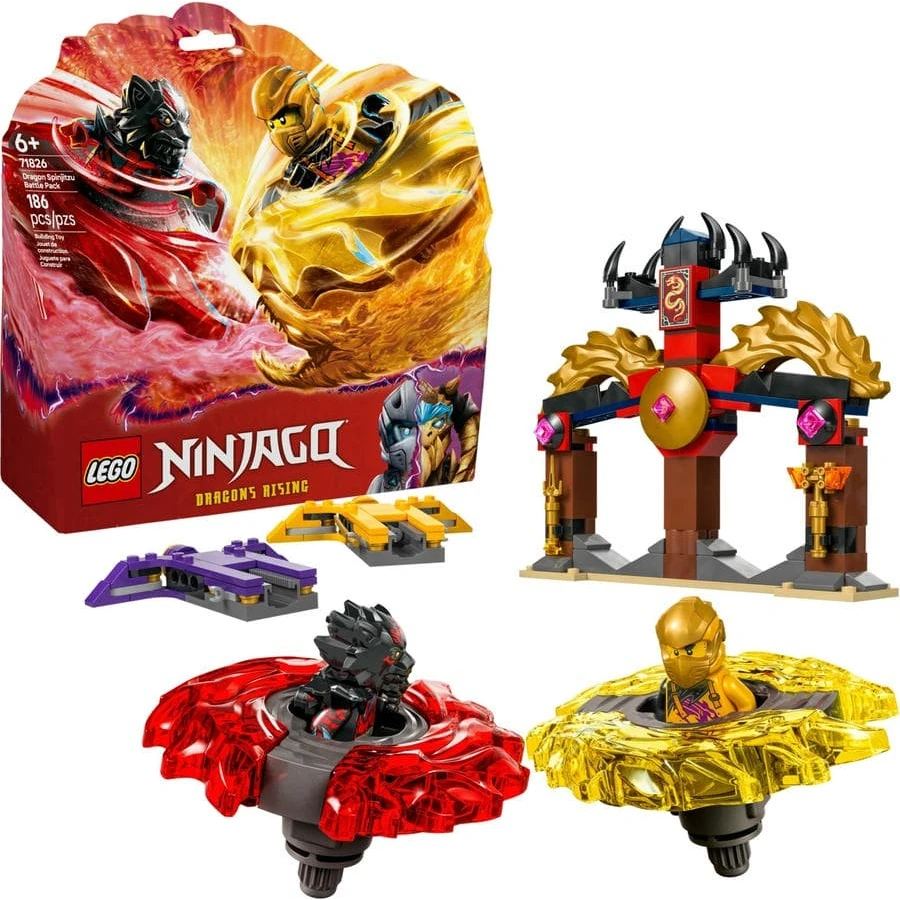 S akční stavebnicí Bitevní balíček dračího Spinjitzu (71826) si kluci a holky od 6 let připomenou úžasné akční scény ze 3. řady televizního seriálu NINJAGO® Dračí povstání. Tato malá akční stavebnice LEGO® obsahuje model chrámu s bojovou arénou, 2minifigurky Arina a Rase a 2 dračí Spinjitzu spinnery, které děti umístí do odpalovačů a během bitev je proto sobě vystřelovat. Děti si vychutnají napínavé dobrodružné souboje dobra proti zlu s Arinovým žlutým spinnerem a Rasovým červeným spinnerem, kt eré mají odnímatelné dílky síly. Tyto postavy ze světa NINJAGO můžou své spinnery vylepšovat zlatými prvky, které můžou vyhrát zasažením a zničením bojové arény. Ve stavebnicích z řady LEGO NINJAGO (prodávají se samostatně) se sestavitelnými bitevními hračkami s nindžovskou tematikou najdete robotické obleky, draky a vozidla a fanoušci si s nimi užijí hodiny akčního nindžovského hraní. Aplikace LEGO Builder vám a vašemu dítěti ukáže snadnou a intuitivní cestu stavitelským dobrodružstvím.
