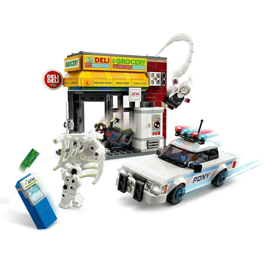 Spider-Verse: Miles Morales vs. Flek (76311) je kvalitní stavebnice navržená pro fanoušky filmu Spider-Man: Napříč paralelními světy od studia Marvel od 9 let. Tato dobrodružná stavebnice LEGO® představuje ideální dárek pro malé superhrdiny, fanoušky studia Marvel a děti, které mají rády sestavitelná kreativní dobrodružství. Stavebnice se Spider-Manem obsahuje 4 minifigurky: Milese Moralese, Fleka, Gwen Stacyovou a strážníka Jeffersona. Samoobsluha má zeď s funkcí výbuchu, která umožňuje vyjmutí bankomatu. Mezi doplňky najdete dlouhé, pružné pavučinové lano a pružnou pavučinu, do které se vejde i minifigurka. Policejní auto lze otevřít a dovnitř umístit 2 minifigurky. Stavitelé můžou přibližovat a otáčet modely ve 3D a sledovat svůj pokrok pomocí zábavné a intuitivní aplikace LEGO Builder pro ještě větší porci digitální zábavy.