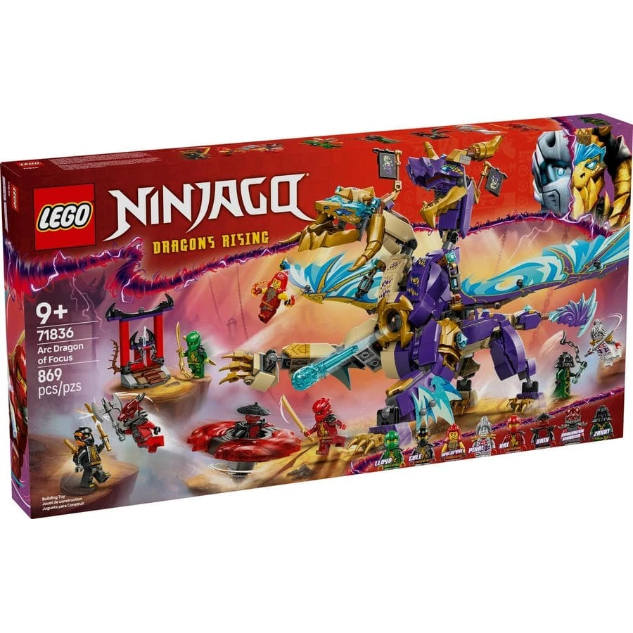 Potěšte kluky a holky od 9 let nindžovskou stavebnicí LEGO® NINJAGO® (71836) Drak soustředění Arc, se kterou si připomenou napínavé akční scény z 3. řady televizního seriálu NINJAGO Dračí povstání. Tato stavebnice obsahuje figurku dvouhlavého draka s pohyblivým ocasem, nohama, chodidly, hlavou, krkem, čelistí a drápy. Děti můžou aktivovat vystřelovač v jeho hrudi a pohybovat jeho velkými fóliovými křídly tam a zpět pomocí páky, která je umístěna na jeho zádech. Tato bojová stavebnice obsahuje 8 minifigurek postav NINJAGO, se kterými se fanoušci nindžů vydají na akční dobrodružství. Součástí je nindža válečník Lloyd, Cole, Wyldfyre a Kai a jejich spojenkyně Pixal, kteří mají nindžovské zbraně, a nechybí padouch Drix, Zarkt a dračí bojovník s vlastními zbraněmi. Součástí stavebnice LEGO je také parádní vozidlo Spinjitzu spinner, se kterým si děti užijí ještě více zábavy při hraní. Malí stavitelé dovnitř umístí minifigurku a stisknou tlačítko na odpalovači, který roztočí spinnery, a pak budou sledovat, jestli po zasažení cíle odletí 2 dílky síly.