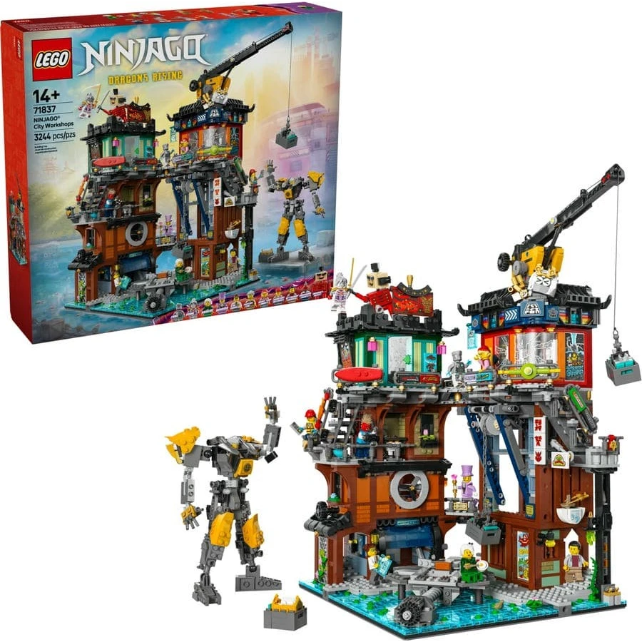 Fanoušci nindžů od 14 let rozšíří svou sbírku modelů LEGO® NINJAGO® City o úžasnou a propracovanou stavebnici Dílny v NINJAGO City (71837). Tento velký nindžovský model obsahuje 4 akcí nabitá patra s byty, obchody a restauracemi, z nichž některá lze vyjmout a hrát si s nimi samostatně, a součástí je také dílna mechanika a 2 funkční jeřáby. Toto je zcela první model z města NINJAGO s pohyblivým robotem, kterého si děti můžou postavit a upravit pomocí řady brnění a samolepek. Jeřábem zvednou a spustí jednotlivé části mezi patry. Až bude robot hotový, malí stavitelé ho můžou vystavit na plošině pro roboty.. Součástí dobrodružné sady je také 10 minifigurek NINJAGO: Zane, Pixal, majitelka obchodu s modely, mechanička v dílně, pracovník restaurace, dračí turista, Dorama, doktora LaRowová, Harumi, Nervák Tima a figurka Doramovy loutky z kostek. Fanoušci si s těmito minifigurkami připomenou velkolepé bitvy z 3. řady televizního seriálu NINJAGO Dračí povstání.