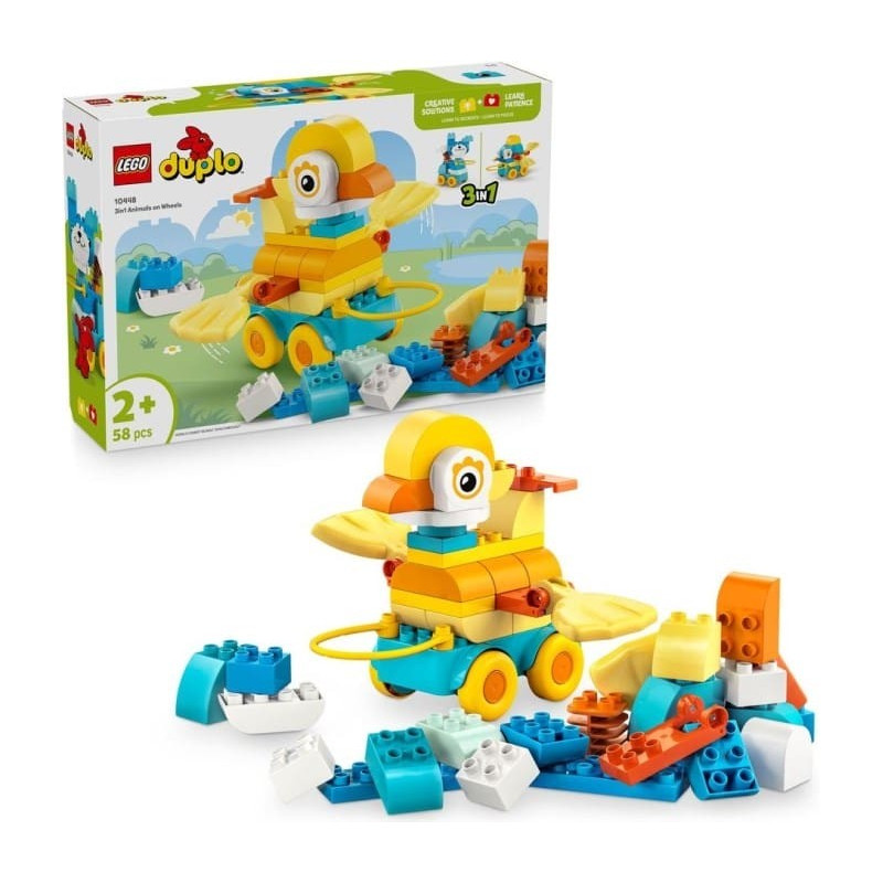 Podpořte dětskou kreativitu se stavebnicí 3 v 1: Zvířátka na kolečkách (10448). Malí milovníci zvířátek si užijí spoustu zábavy při stavění kachny, ryby nebo psa, které pak můžou přestavit na zcela nová zvířátka! Malé děti, které milují vozidla LEGO® DUPLO®, připevní figurky na podložky s kolečky a pak se s nimi vydají na projížďku – nebo je můžou tahat za rukojeť. Tento dárek pro batolata je plný pohyblivých funkcí, včetně ocasu a závěsných dílků, se kterými si děti užijí spoustu zábavy a zdokonalí své jemné motorické dovednosti. Děti zapojí své soustředění, trpělivost a představivost při nekonečném stavění a přestavování kreativních zvířátek. S touto hračkou se malé děti můžou těšit na spoustu hravých vzdělávacích momentů. Tato stavebnice LEGO DUPLO 3 v 1 obsahuje kostky, které se snadno rozebírají a děti se s ní snadno naučí, jak vyvážit podvozek, aby se jejich výtvor nepřevrátil. Obsahuje 58 dílků.
