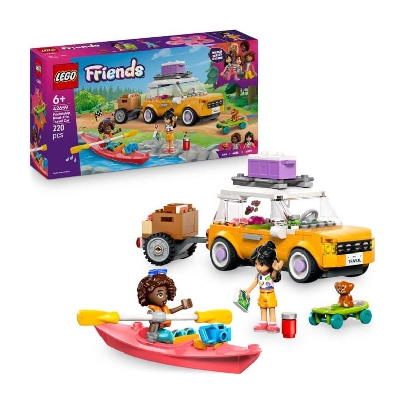 Vstupte do světa dobrodružství se stavebnicí LEGO® Friends (42659) Výlet v autě s přáteli pro holky a kluky od 6 let. Tato akcí nabitá stavebnice obsahuje model auta s přívěsem, 2 minipanenky LEGO Friends, roztomilou figurku štěňátka a spoustu doplňků, které inspirují k zábavnému hraní. Vydejte se s dětmi na kreativní cestu a pomozte Liann a Aliye naložit do auta a odnímatelného přívěsu vše, co potřebují na cestu. Kamarádky sedí vepředu – vzadu v autě je sedadlo pro pejska Airu. Mezi doplňky najdete kajak, 2 helmy, skateboard, kolečkové brusle, 2 židle a chladicí box se sendvičem, donutem, sušenkou, třešněmi a pamlsky pro psa. Až přijde čas na svačinu, chladicí box poslouží i jako piknikový stůl. Objevte další skvělé stavebnice ze světa LEGO Friends (prodávají se samostatně) podporující rozvoj sociálních a emočních dovedností. Tato stavebnice je kompatibilní s aplikací LEGO Builder, která přináší intuitivní stavitelské dobrodružství. V ní děti můžou přibližovat a otáčet modely ve 3D, ukládat své stavebnice a sledovat svůj postup při stavění.