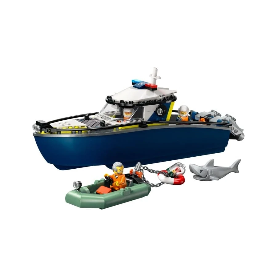 Záludný zloděj v superrychlém člunu uhání z přístavu LEGO® City s ukradeným rubínem! Ponořte se do akce s policisty na palubě velké policejní lodě! Toto majestátní plavidlo má vše, co potřebujete k chytání zločinců, včetně dvou závěsných motorů a cely na palubě. Vyhněte se hladovému žralokovi v zuřivých vlnách a zachraňte situaci. Čas na honičku v LEGO® City!