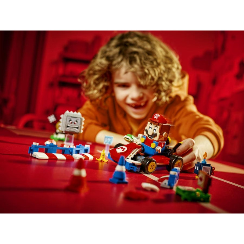 Připravte se na závod s LEGO® Mariem! Postavte si vlastní jedinečnou závodní dráhu pomocí bariér a dopravních kuželů. Jezděte, driftujte a střílejte krunýře z motokáry Standard Kart a spouštějte zvuky a vizuální efekty Mario Kart™. Získejte odměnyz krabice Item Box a sledujte, jak LEGO Mario™ reaguje na zelené a červené destičky LEGO. Porazte Bob-omba a Thwompa a oslavte vítězství v kruhu vítězů!