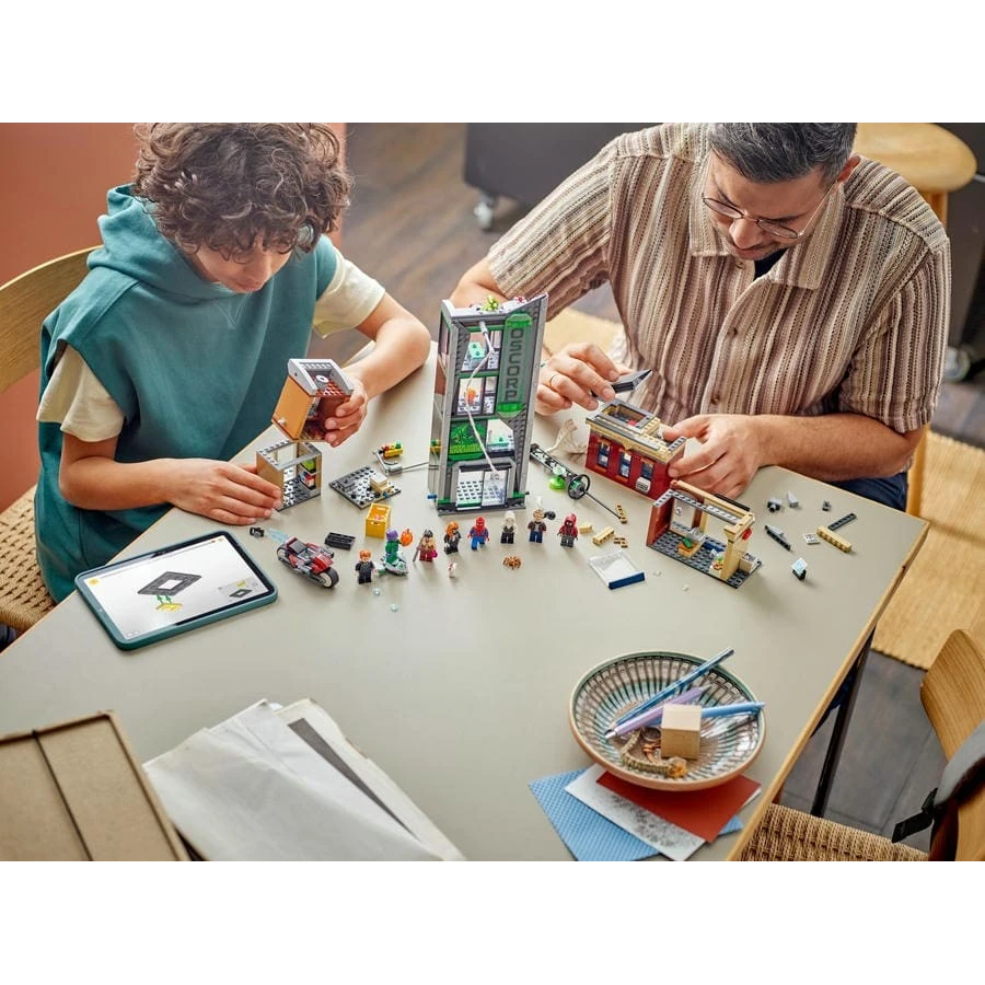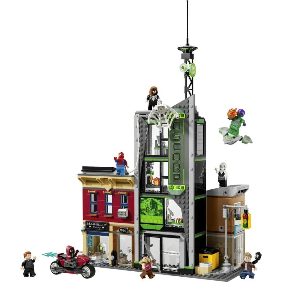 Prémiová stavebnice LEGO® ǀ Marvel (76324) Spider-Man vs. Oscorp je plná superhrdinské akce, oblíbených postav a slavných míst. Tato městská scéna s řadou modelů představuje působivý dárek pro milovníky superhrdinů a sběratelských předmětů Marvel od 10 let. Pouliční scéna obsahuje 3 samostatné budovy: byt Milese Moralese s klenotnictvím v přízemí, kancelářskou budovu Oscorp a Venomův byt s večerkou v přízemí. Každá místnost obsahuje příslušné vybavení a doplňky. Osm minifigurek LEGO z filmů od studia Marvel se postará o nekonečné akční hraní s pavučinami: Spider-Man, Spider-Woman, Miles Morales s motorkou, Eddie Brock, Ghost-Spider, Norman Osborn, lovec Kraven a Zelený Goblin s kluzákem. Díky průhledným tyčím můžou děti umisťovat a polohovat postavy do realistických póz. Stavějte tuto zábavnou stavebnici společně s přáteli a rodinou pomocí aplikace LEGO® Builder. Stavebnice obsahuje 808 dílků.