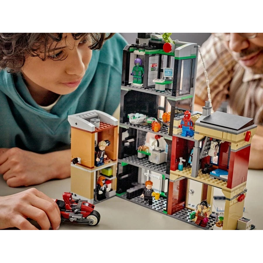 Připojte se ke Spider-Manovi, Ghost-Spider, Milesovi Moralesovi a jejich přátelům a užijte si akční souboj se Zeleným goblinem, Venomem a dalšími padouchy v ulicích New Yorku! S motorkou, kluzákem, parádními zbraněmi a pavučinami vás čekají akční dobrodružství v budově Oscorp, bytě Milese Moralese, obchodech a dalších budovách. Nastal čas na velkolepé zúčtování superhrdinů!
