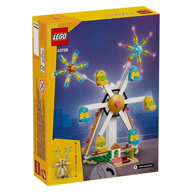 Oslavte jakoukoli výjimečnou příležitost stylově se stavebnicí LEGO® Creator (40758) Oslava: Ruské kolo s ohňostrojem. Tato úžasná stavebnice zábavního parku obsahuje ruské kolo se 6 kabinami a srdce – symbol všech produktů z řady LEGO Oslava. Děti rozpohybují ruské kolo otáčením mechanismu na zadní straně. Barevné ohňostroje z průhledných dílků lze vystavit a napolohovat na horní straně ruského kola nebo na jeho boku.