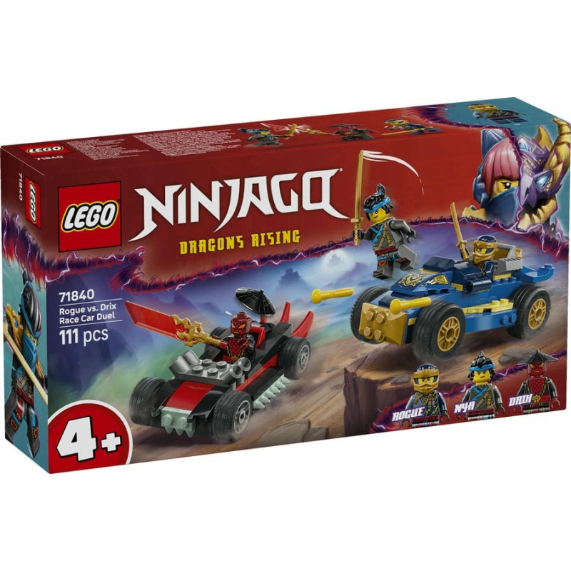 Potěšte svého malého nindžu akční stavebnicí LEGO® NINJAGO® (71840) Rogue vs. Drix a souboj se závodními auty. S touto hrdinskou stavebnicí se nápadité děti od 4 let naučí stavět a můžou si přehrávat napínavé automobilové honičky z 3. řady televizního seriálu NINJAGO Dračí povstání. Tato stavebnice LEGO obsahuje 2 modely nindžovských vozidel – nindžovské auto s pohyblivými koly a 2 vystřelovači se 4 šipkami a auto padouchů. Děti za volant každého z nich posadí minifigurku – a závody můžou začít! Součástí jsou také 3 minifigurky NINJAGO: Nindža bojovníci Rogue a Nya vyzbrojeni zlatými katanami a zlý Drix s průsvitnou odhalující čepelí. Tato dobrodružná fantasy stavebnice s nindži byla navržena pro děti od 4 let, které se teprve seznamují s kostkami LEGO. Nechybí začátečnická kostka, jež představuje částečně sestavenou základnu, a děti se tak mohou bez zaváhání pustit do stavění. Stavebnice se skládá ze 111 dílků.