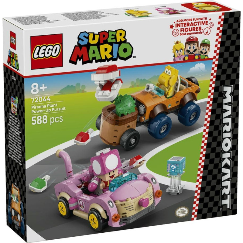 Spojte se s Toadette nebo s Koopa Troopem a vydejte se na dobrodružnou honičku za Piranha plant s touto stavebnicí Mario Kart™ (72044) pro děti. Stavebnice představuje skvělý dárek LEGO® Super Mario™ pro kluky, holky a gamery od 8 let a obsahuje detailní sestavitelný model Toadette v Cat Cruiseru a Koopa Troopu v motokáře Tanooki Kart. Obě motokáry mají funkci driftování a funkci střílení granátů v podobě krunýřů. Připevněte figurku Piranha Plant k některé z motokár a sledujte, jak se pohybuje, když je motokára v pohybu. Přidejte figurku LEGO® Mario™, LEGO® Luigi™ nebo LEGO® Peach™ (ze stavebnic 71439, 71440, 71441 nebo 72043 – prodávají se samostatně) a vychutnejte si interaktivní hraní, včetně získávání náhodných předmětů z krabice Item Box a spouštění zvukových a vizuálních efektů Mario Kart při řízení. Prohlédněte si řadu stavebnic LEGO Super Mario: Mario Kart (prodávají se samostatně) a získejte další vozidla a postavy pro ještě větší porci zábavy. Návod na stavění najdete v krabici nebo v aplikaci LEGO Super Mario. Tato stavebnice obsahuje 588 dílků.