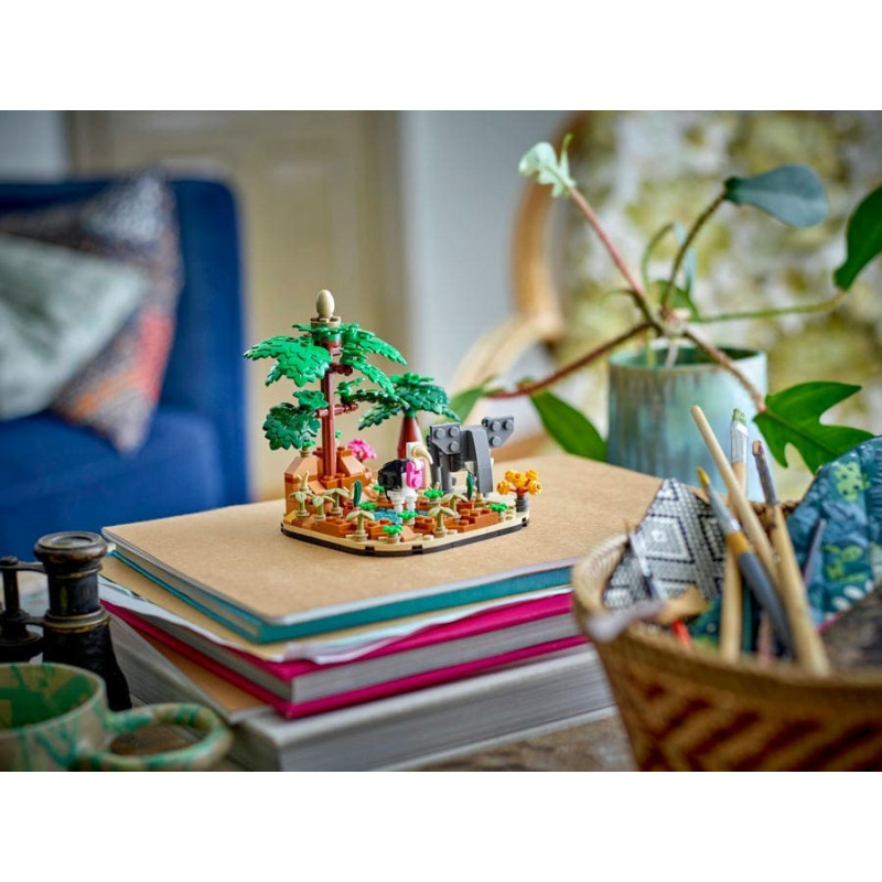 Výstavní model LEGO® (40784) Africká savana – diorama je třetí stavebnice ze sběratelské série LEGO, která oslavuje zázraky přírody. Tato pestrobarevná scenérie je plná fascinujících detailů a divoké přírody savany. Připravte scénu sestavením stromů, vody a květin. Přidejte figurku mladého slona a čápa marabu a umístěte čapí vejce na strom. Tato stavebnice představuje skvělý dárek pro děti od 12 let a všechny milovníky přírody.