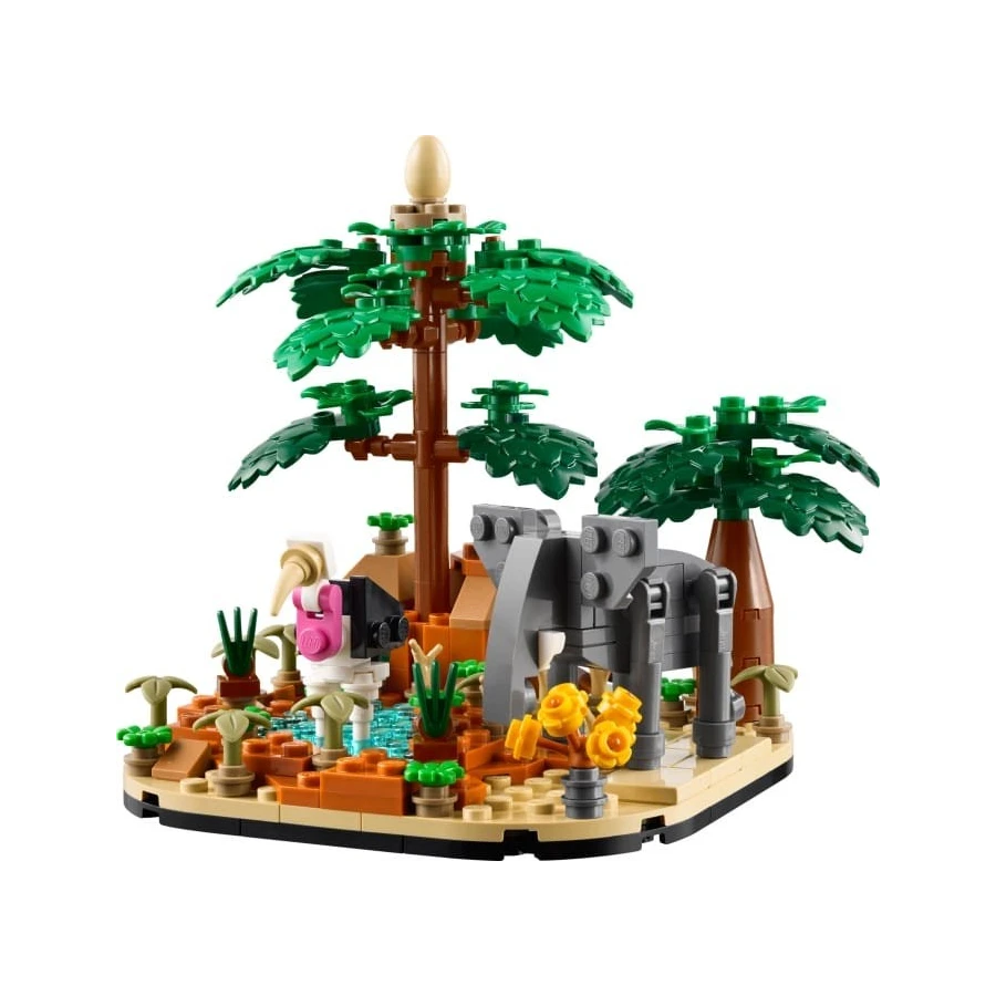 Propracovaný výstavní kousek s motivem přírody – Model LEGO® Africká savana – diorama obsahuje figurku slona a čápa a zobrazuje scenérii savany se spoustou detailů, které můžete objevovat